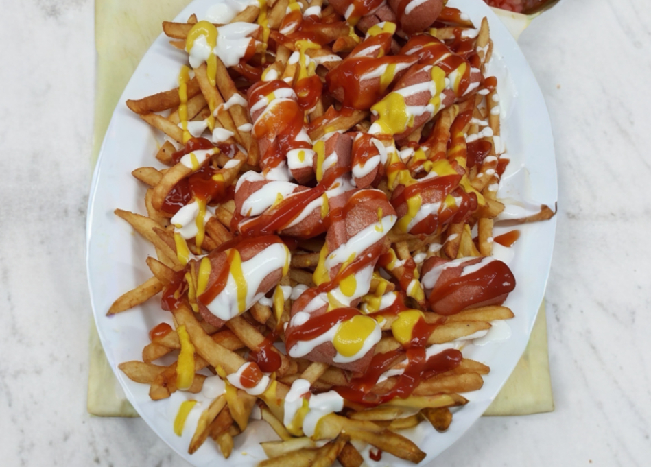 300 gr de papa frita , salchicha de pavo en rebanadas, catsup,mostaza y queso derretido
