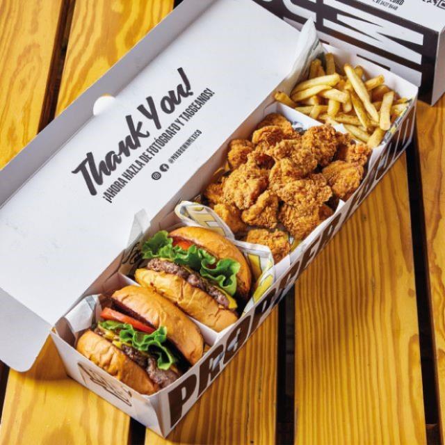 ELIGE 2 BURGERS A TU ELECCION, CON 20 PIEZAS DE BONELESS (SALSA APARTE) Y 280 G DE PAPAS A LA FRANCESA