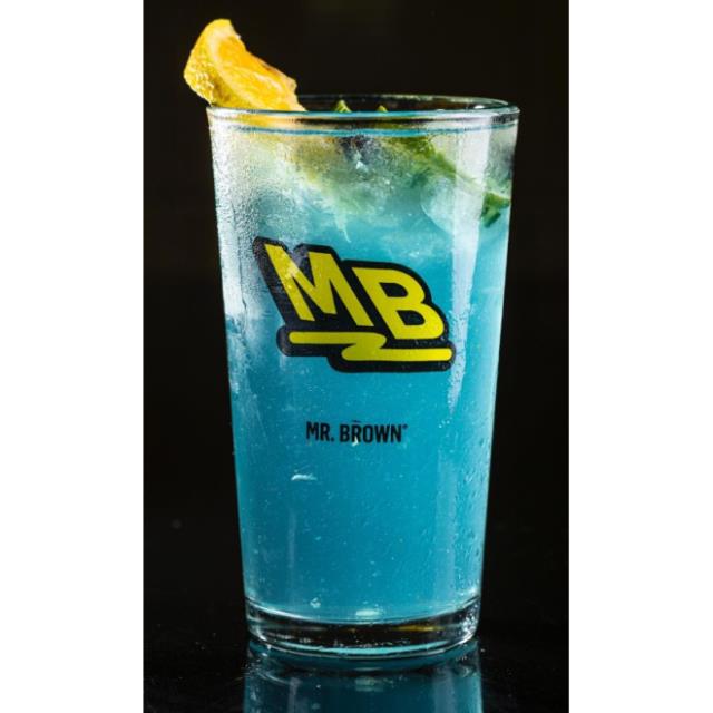 JUGO DE LIMÓN, BLUE SUGAR, SEVEN UP, PEPINO, NARANJA, BLUEBERRIES Y MENTA.