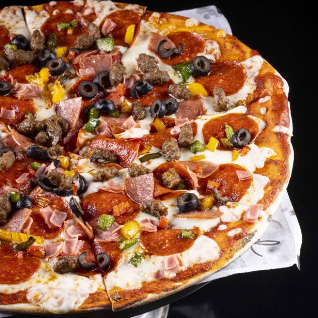 14" SALSA DE TOMATE, 200G DE QUESO MOZZARELLA, JAMON DE PAVO, JAMON DE PIERNA, SALAMI, PEPPERONI, SALCHICHA ITALIANA, ACEITUNAS NEGRAS Y PIMIENTOS