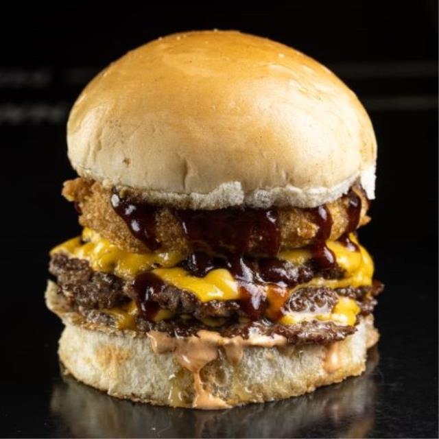 PAN BRIOCHE, DOBLE PATTY DE 80G. PRIME MEAT SMASH, DOBLE QUESO AMERICANO, MERMELADA DE TOCINO, CEBOLLA FRITA Y ADEREZO DE LA CASA