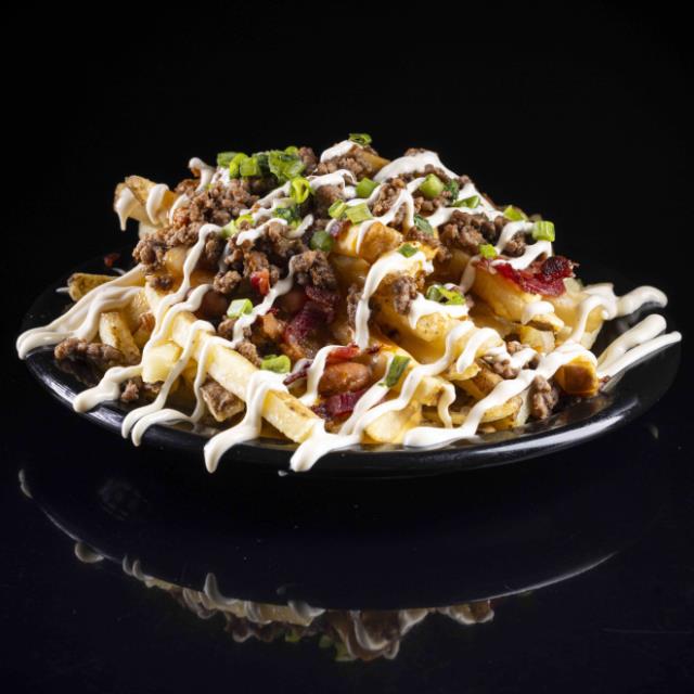240 G DE PAPAS A LA FRANCESA CON SALSA DE QUESO, CHILI HOME MADE, CARNE MB, TOCINO, DIP DE AJO Y CEBOLLIN
