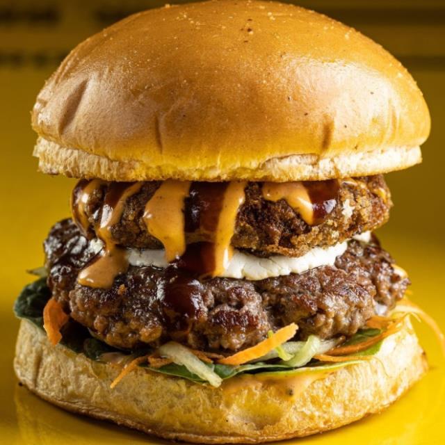PAN BRIOCHE, DOBLE PATTY DE 80G. PRIME MEAT SMASH, DOBLE QUESO AMERICANO, ADEREZO DE LA CASA, HUEVITO ESTRELLADO, TOCINO AHUMADO Y MIEL DE MAPPLE