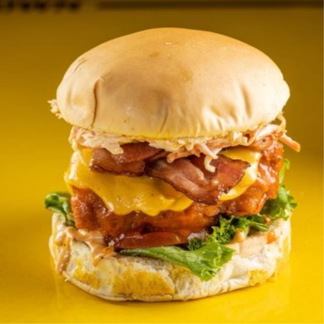PAN BRIOCHE, 140 G DE PECHUGA DE POLLO EMPANIZADA, QUESO SUIZO, GUACAMOLE, LECHUGA, TOMATE, CEBOLLA MORADA Y ADEREZO RANCH.