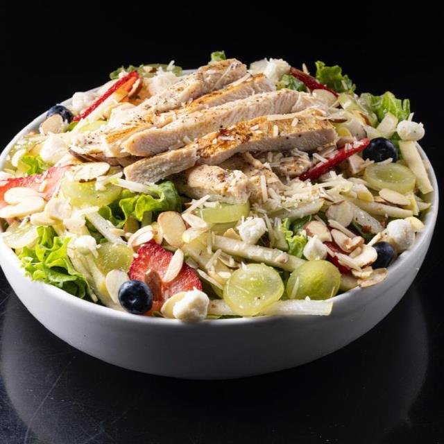 LECHUGA ITALIANA, PARMESANO, MANZANA, PERA, FRESA, QUESO DE CABRA, ALMENDRA, UVA, BLUEBERRIES, 140G DE PECHUGA A LA PLANCHA, Y VINAGRETA DE MANGO