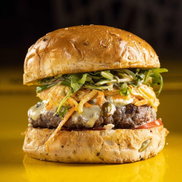 PAN BRIOCHE, 180 G. PRIME MEAT, QUESO MANCHEGO, JAMÓN DE PIERNA, ARO DE CEBOLLA, ESPINACA BABY, PASTA DE CHILE SERRANO, MAYO CHIPOTLE Y TOMATE.