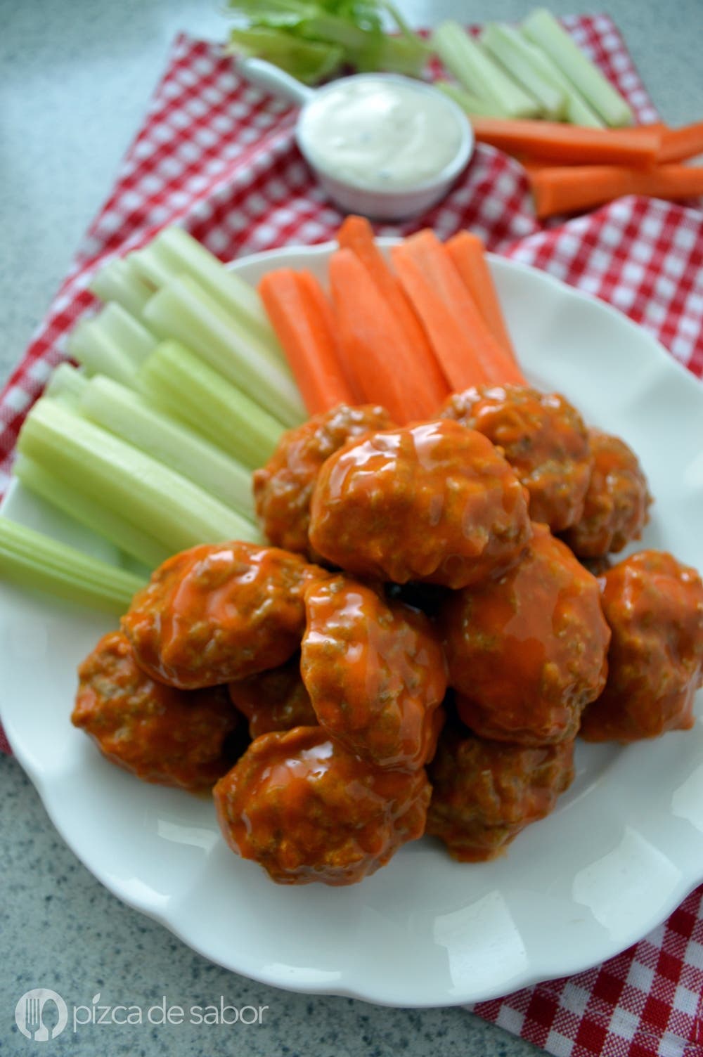 Tiritas de pollo fritas y bañadas en salsa búfalo, no incluye ensaladas