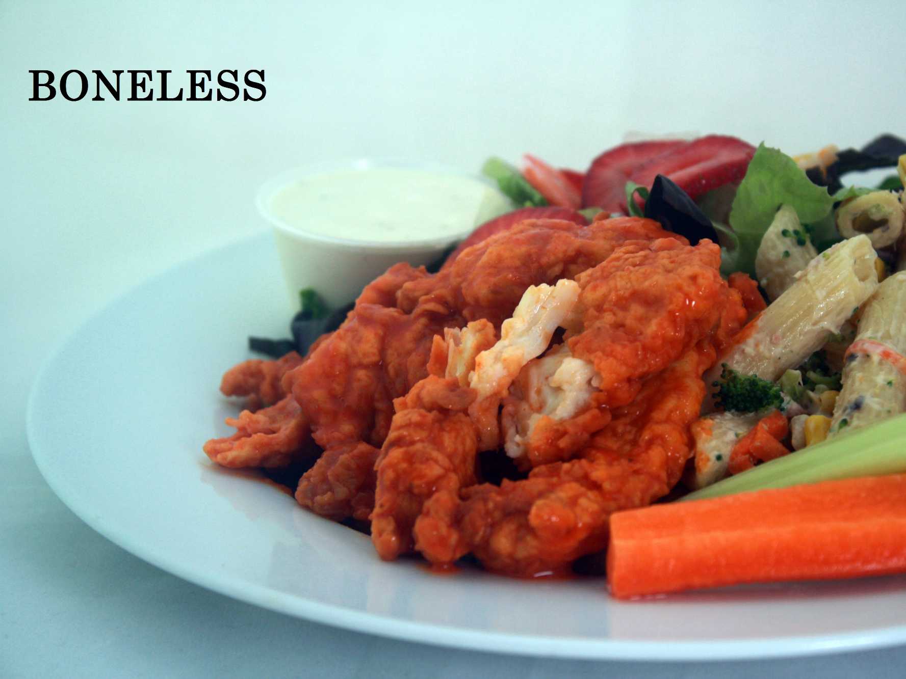 Tiras de pechuga de pollo fritas y bañadas en salsa búfalo, incluye 2 complementos y un blue cheese para los boneless.
