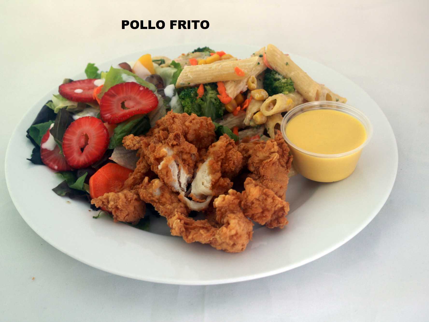 Tiras de pechuga de pollo empanizadas y fritas, incluye 2 complementos.