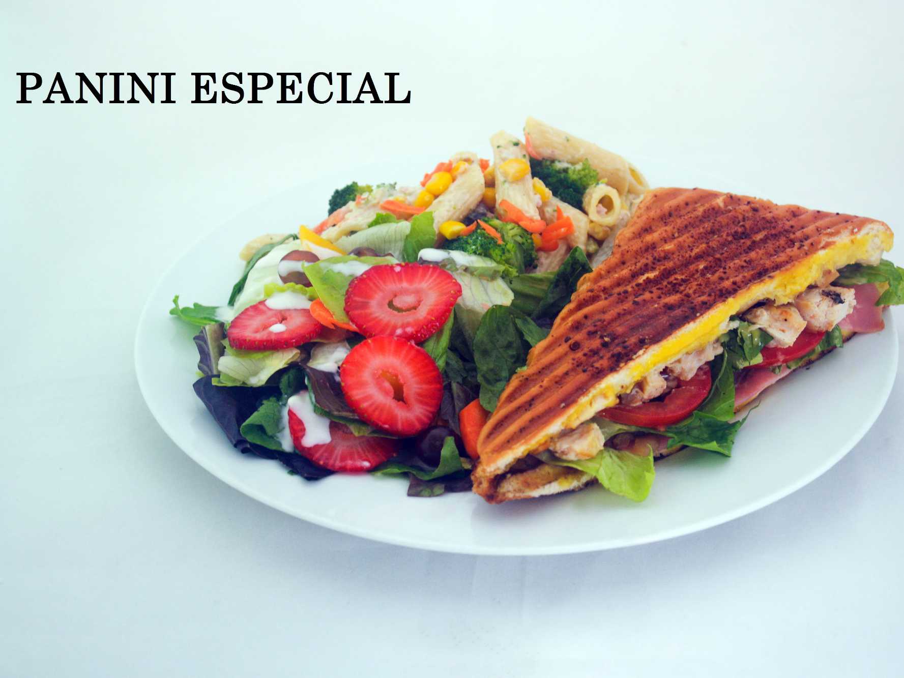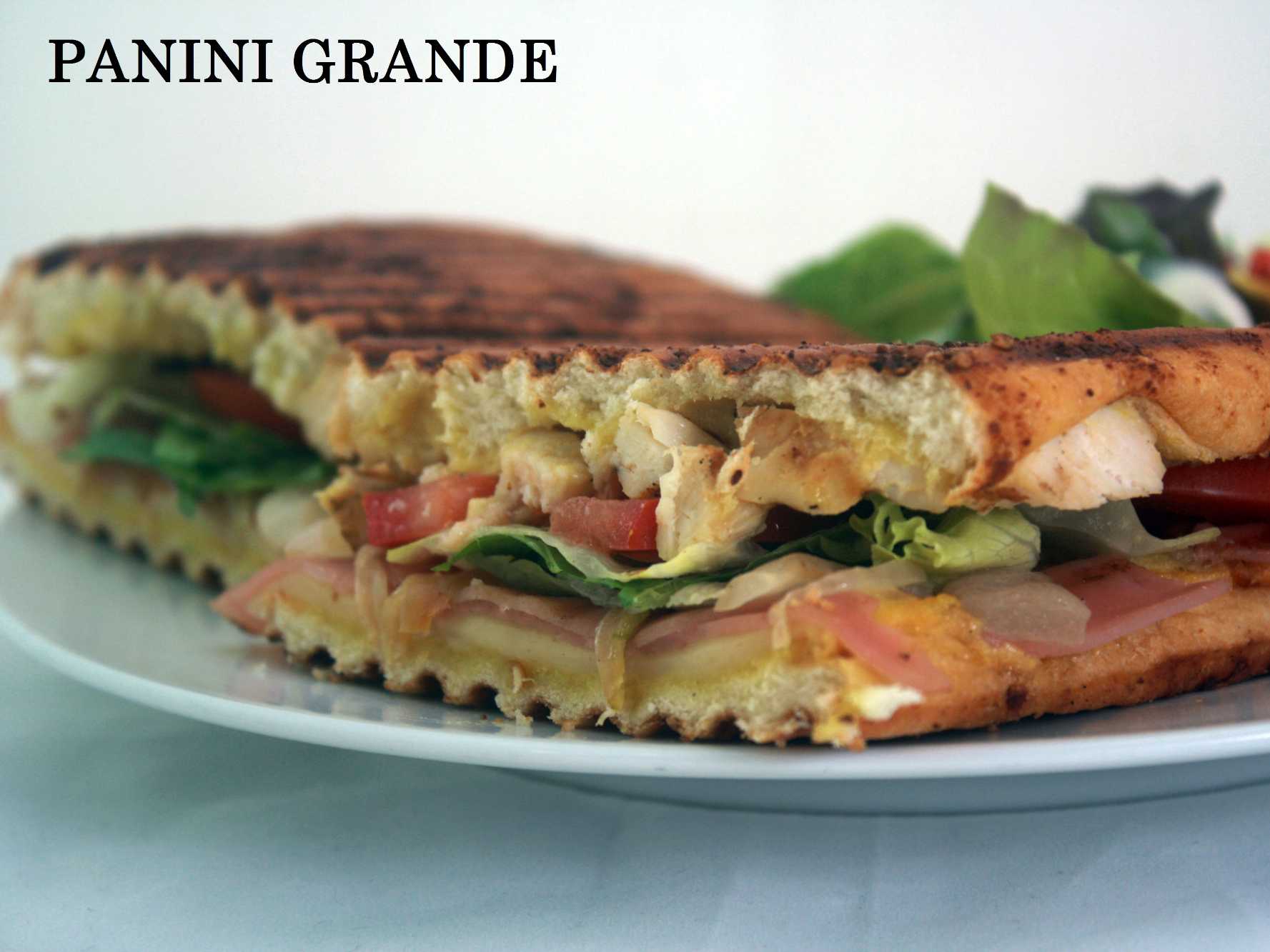 Incluye un Panini Grande y un complemento de ensalada, todos los paninis incluyen queso gouda, lechuga, tomate y cebolla caramelizada.