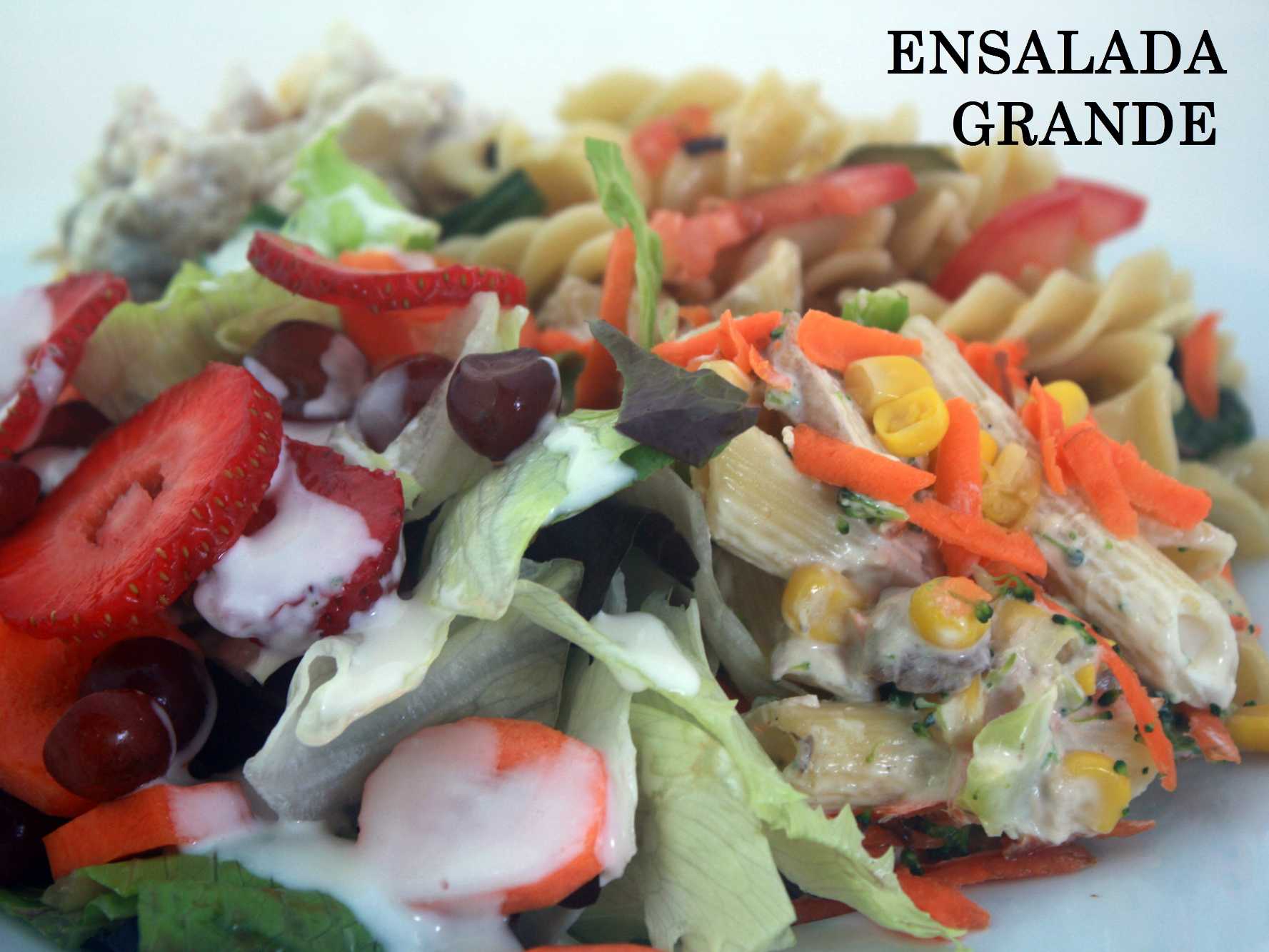 Escoge dos ensaladas y encima le ponemos fajitas de pechuga de pollo a la parrilla.