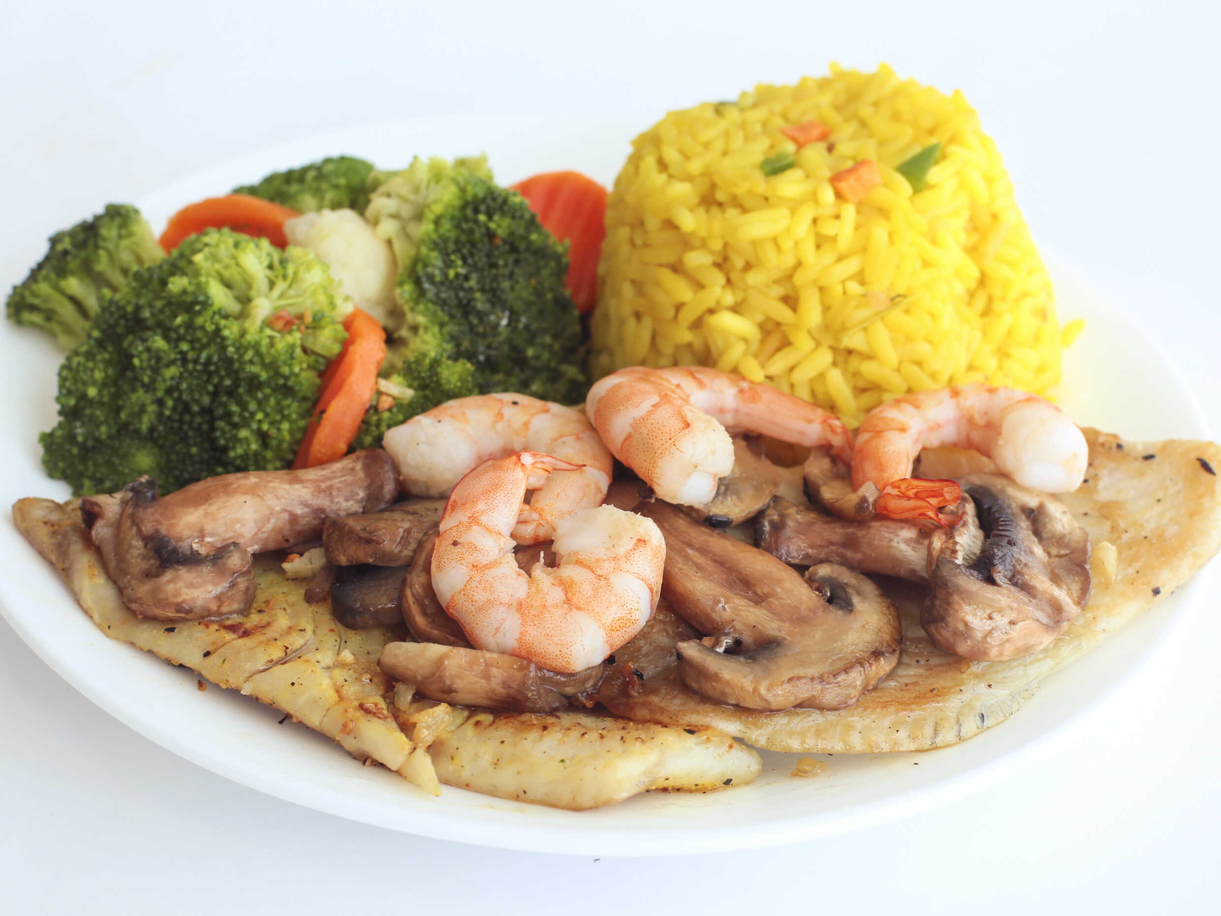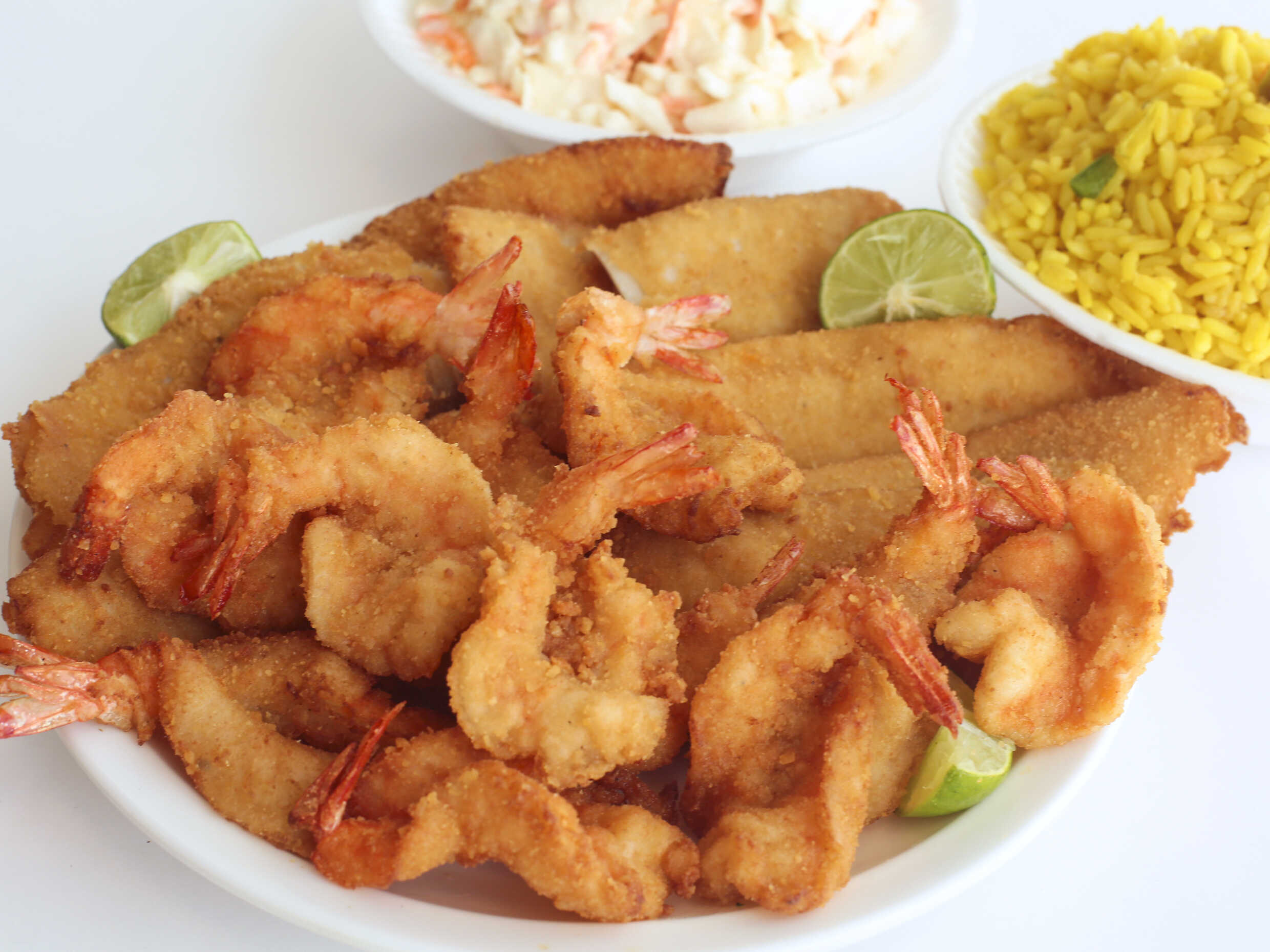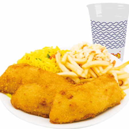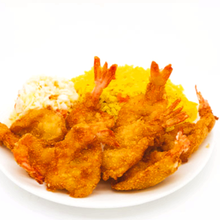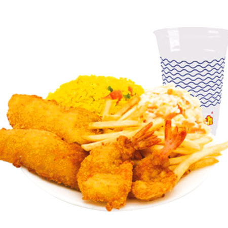 Filetes y camarones empanizados acompañados de 1/2 litro de arroz, 1/2 litro de col y papas a la francesa.