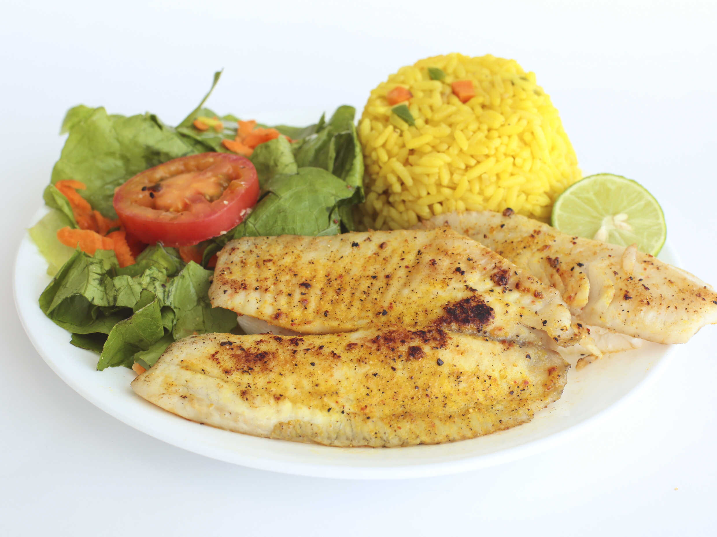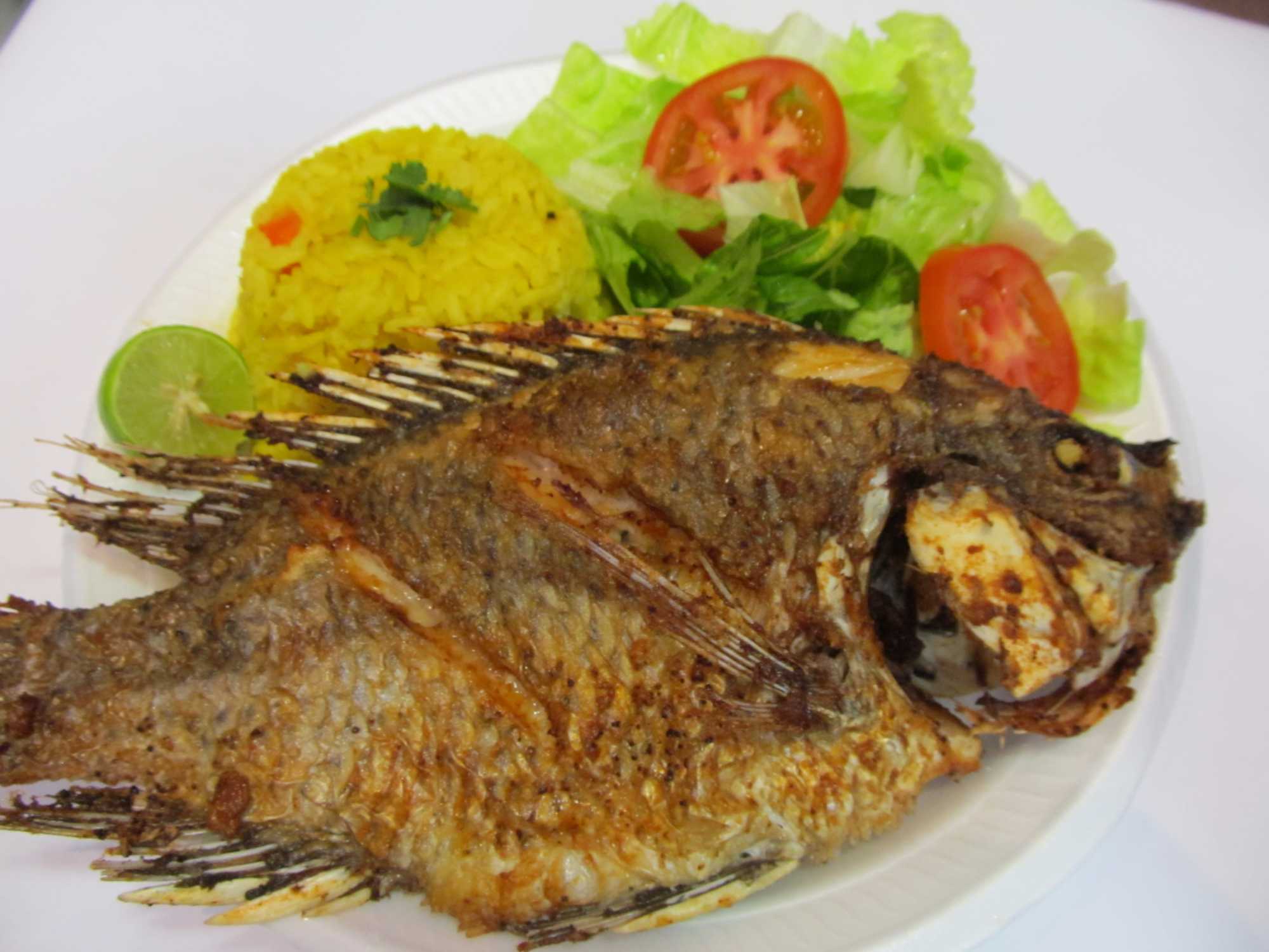 Deliciosa mojarra bien doradita acompañada de arroz y verduras