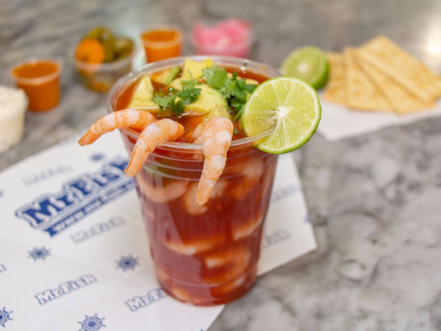 muy rico coctel de camaron pacotilla, salsa coctelera, cebolla, cilantro y aguacate