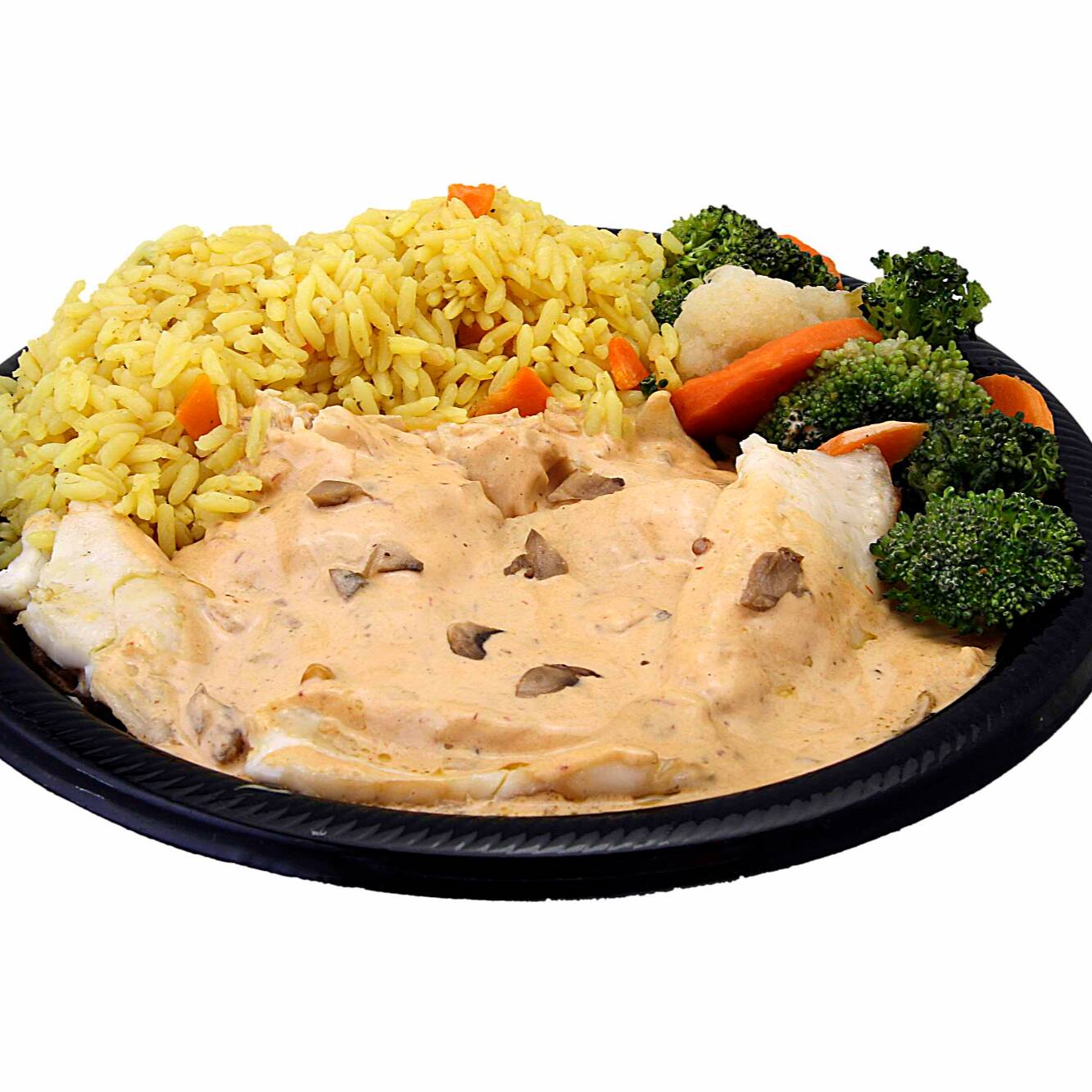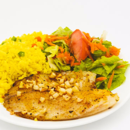 Filete al mojo de ajo cpn hojuelas de ajo acompañado de arroz y verduras al vapor
