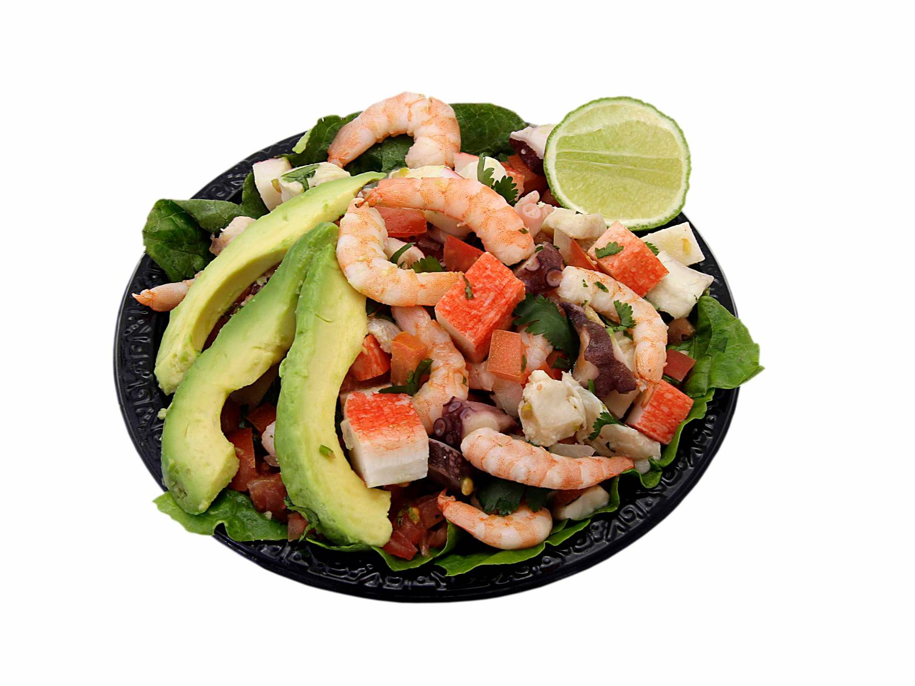 con pulpo, camarón, ceviche, tomate, cebolla y aguacate aderezada con toque de aceite de olivo y vinagreta