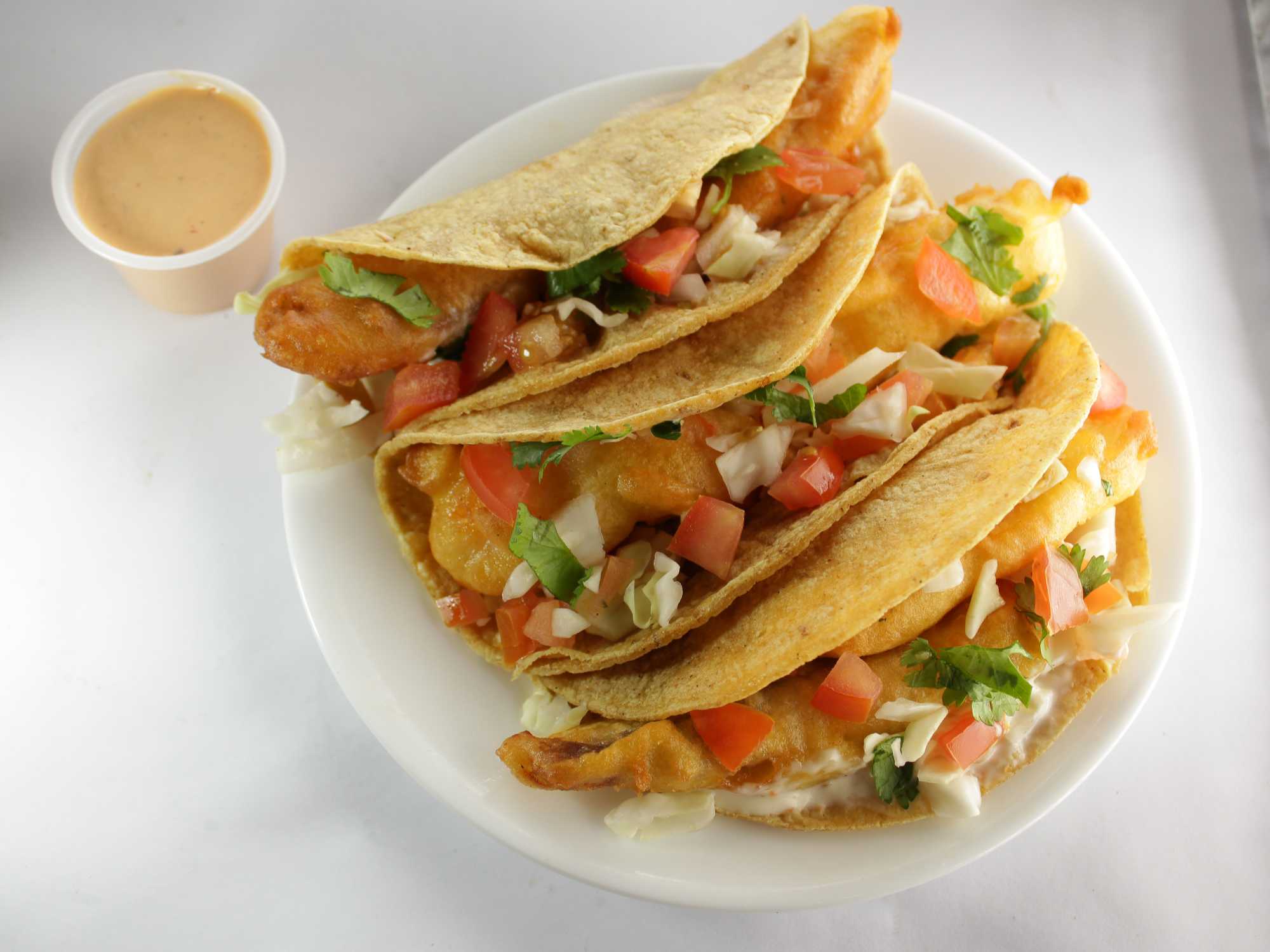 deliciosos tacos de camaron estilo Baja, capeados y con salsa chipotle, una delicio