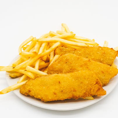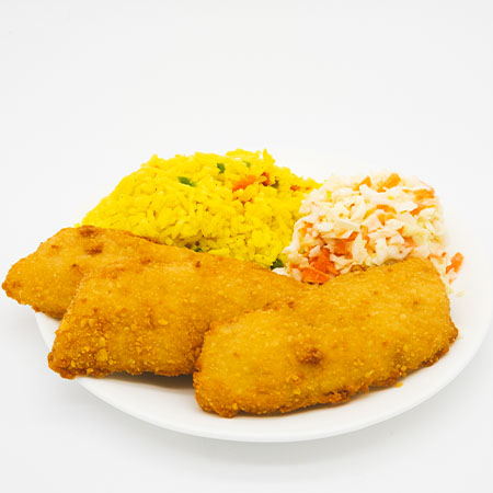 Filetes empanizados, acompañados de 1/2 litro de arroz, 1/2 ensalada de col o papas francesas y salsa tártara.