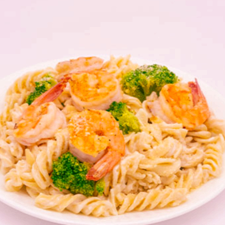 deliciosa pasta fusilli cremosa con camarones sazonada con toque ajo y parmesano
