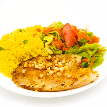 Filete tilapia cocinado al vapor, cero grasa acompañado de arroz azafranado y verduras al vapor.