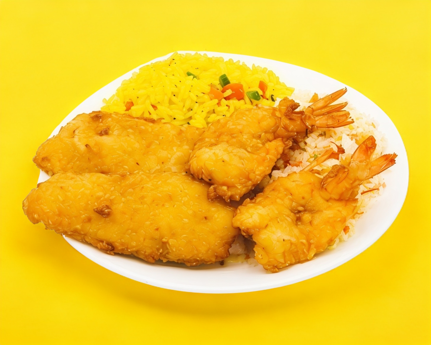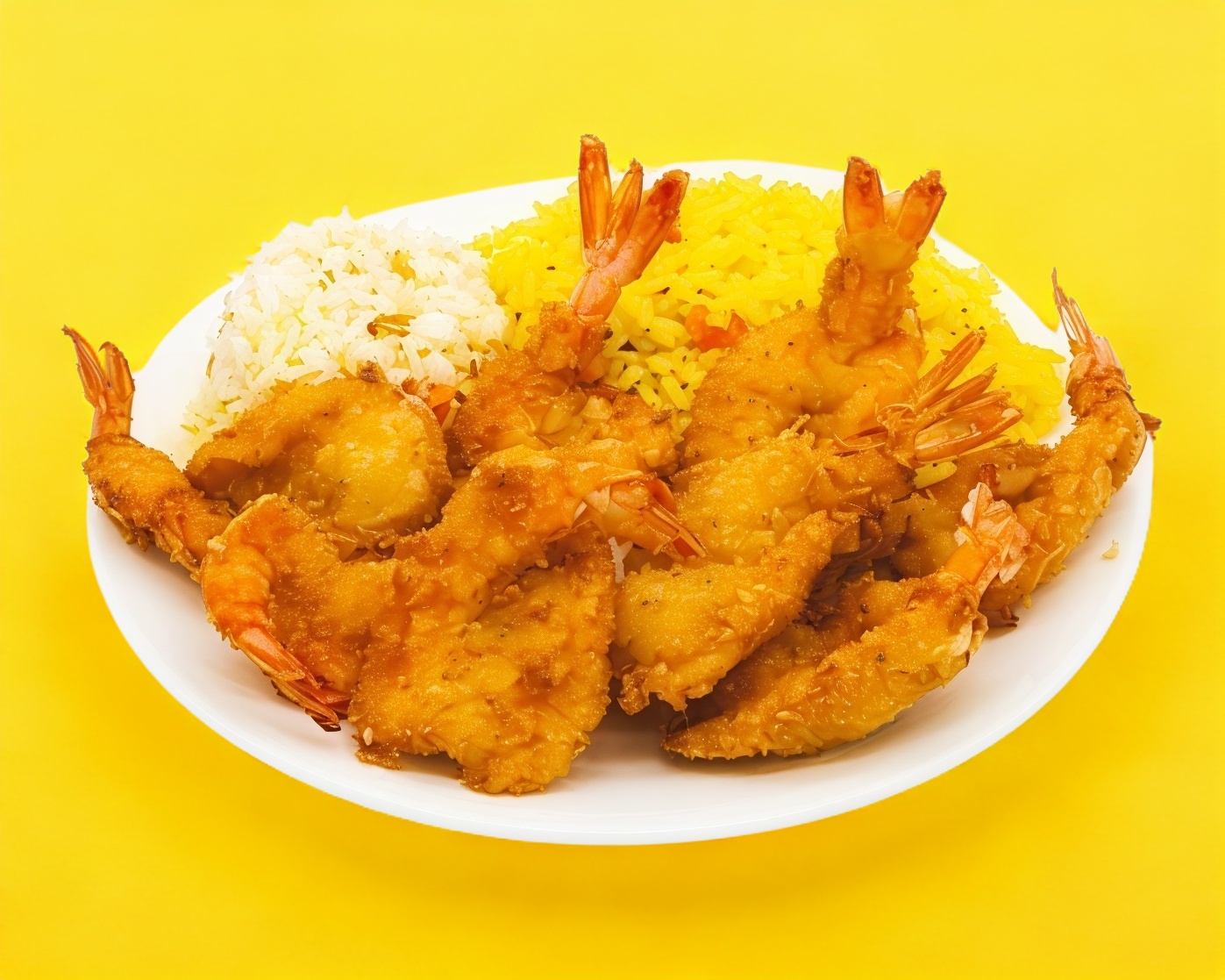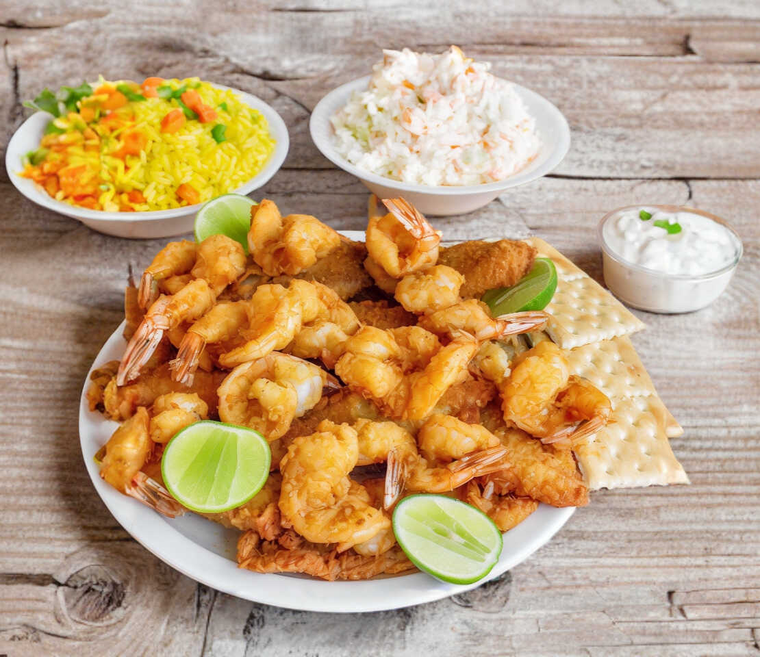 6 camarones empanizados acompañados de arroz azafranado y ensalada de col, salsa tartara, galletas