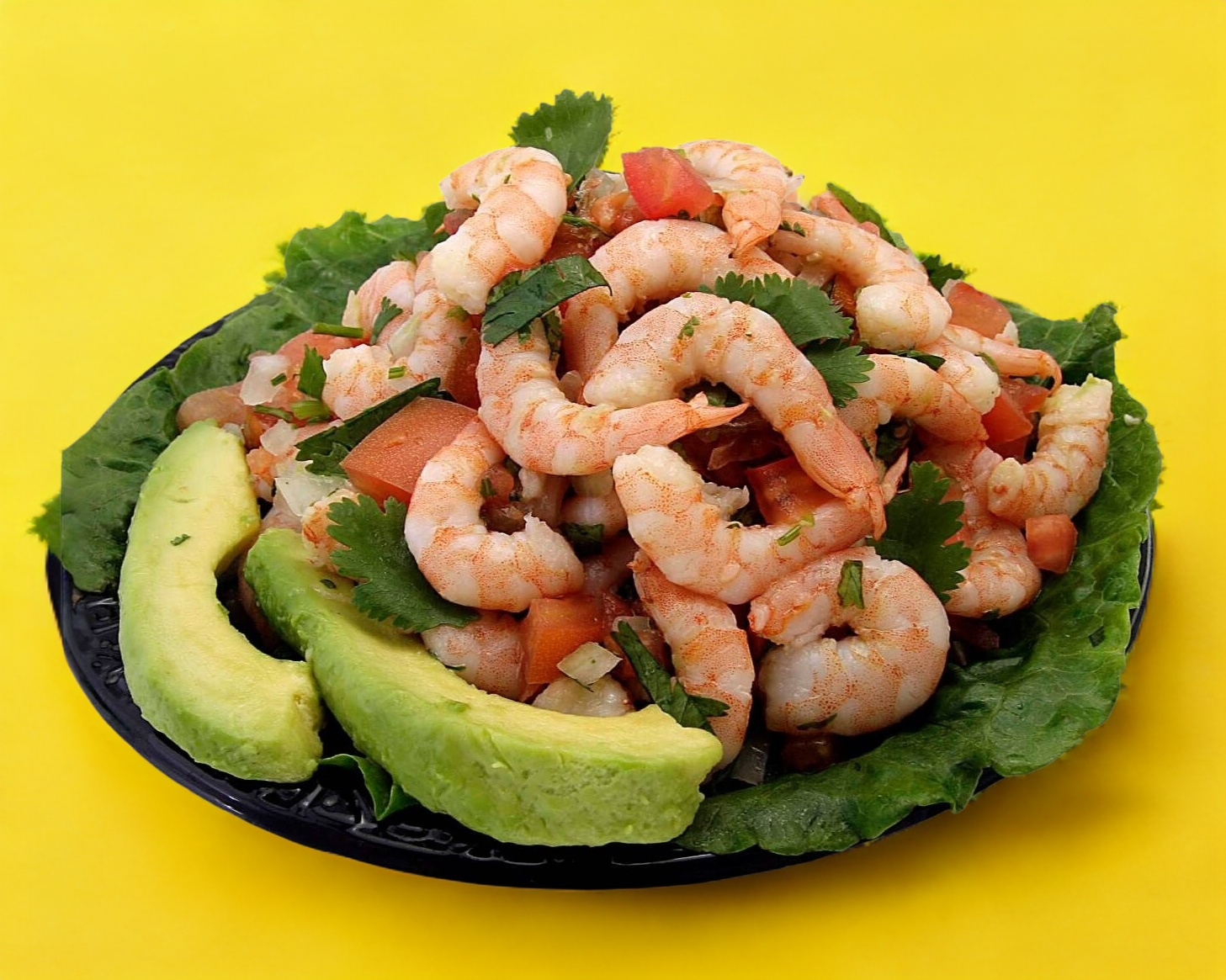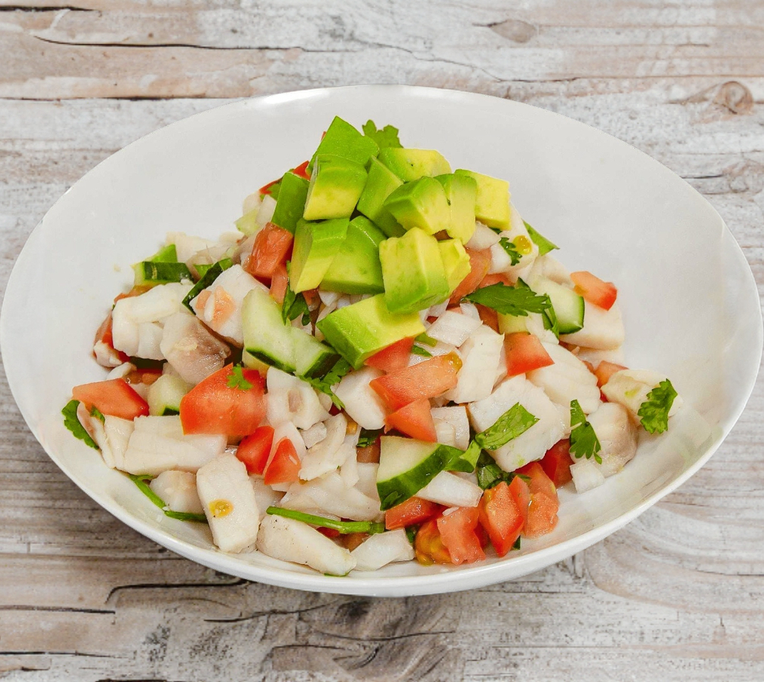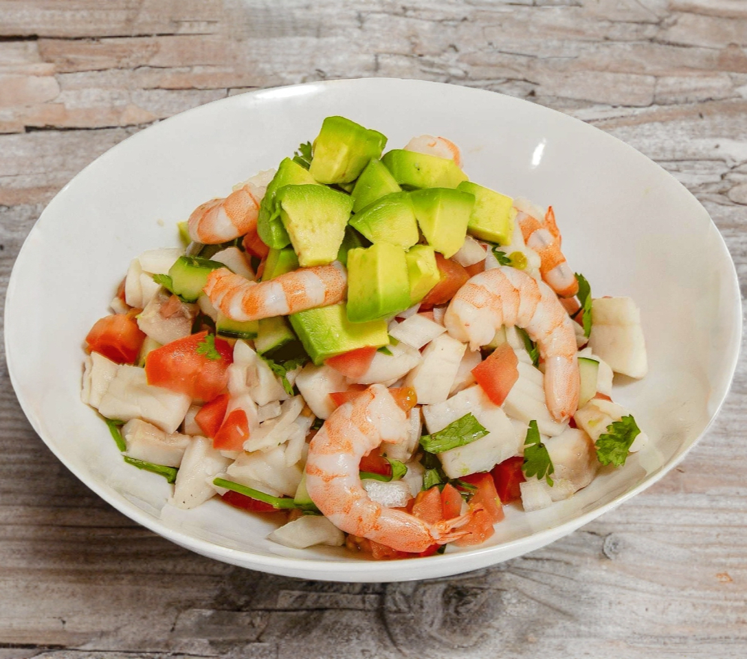 Camarones, tomate, cebolla, cilantro y aguacate, aderezado con limón y aceite de oliva.