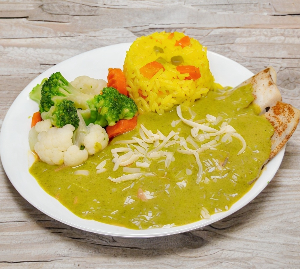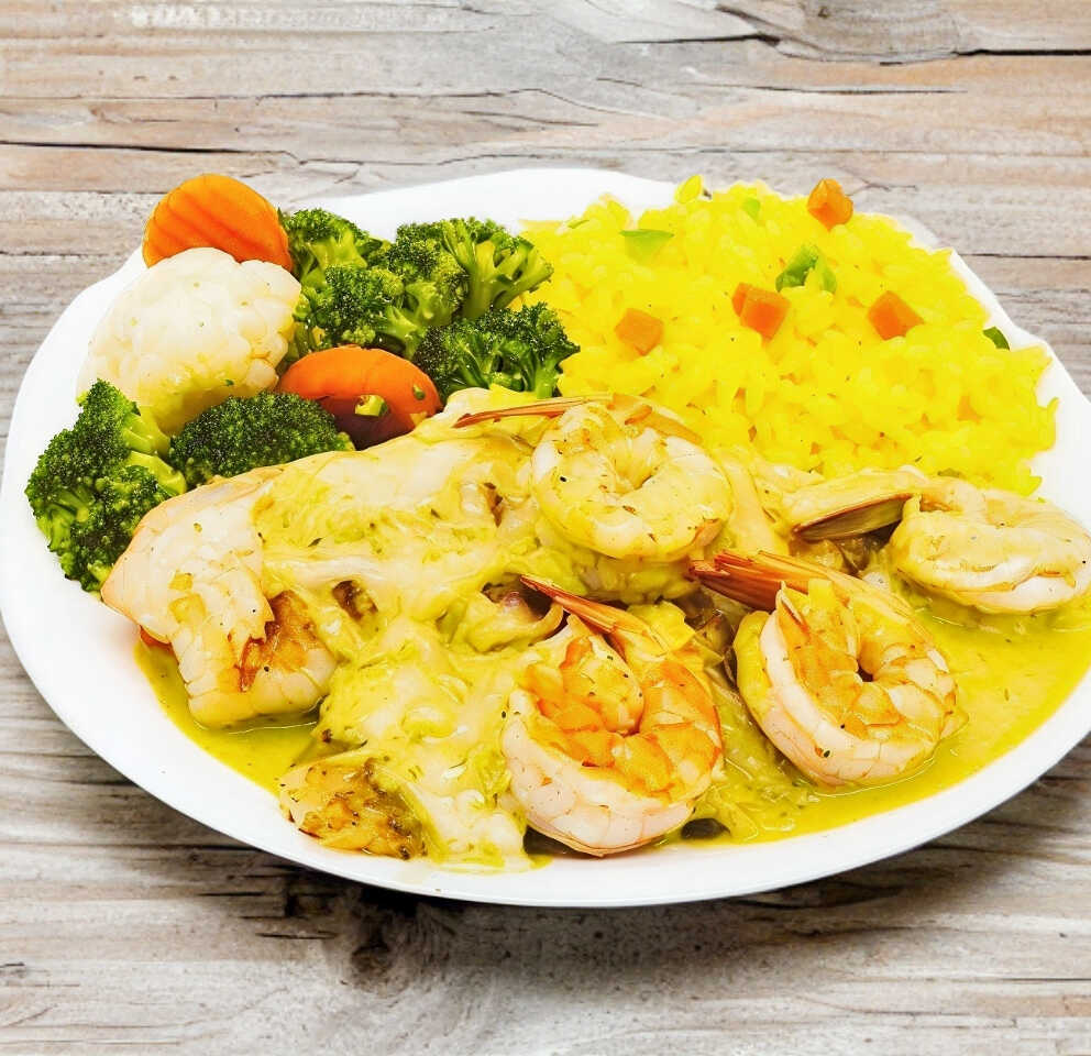 Camarones y filete a la plancha, bañados con deliciosa salsa de cilantro y queso espolvoreado, acompañados de arroz y verduras al vapor.
