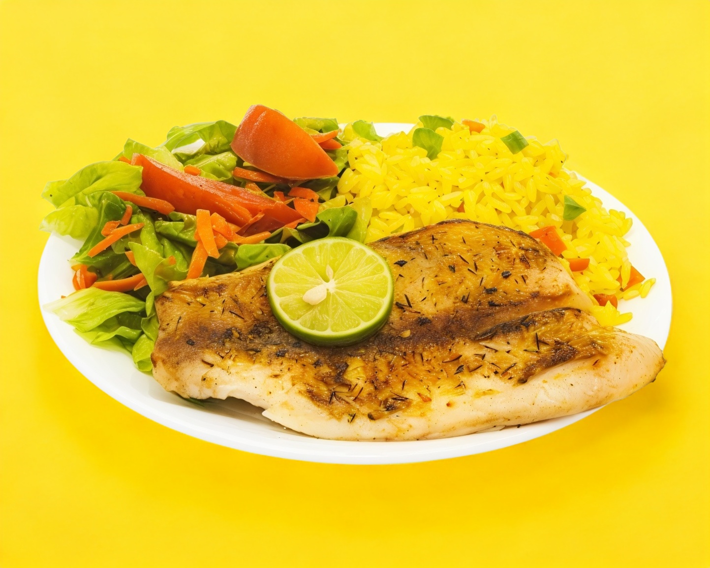 Filete tilapia sazonado a la plancha y bañado con salsa de cilantro y queso, acompañado de verduras y arroz azafranado.