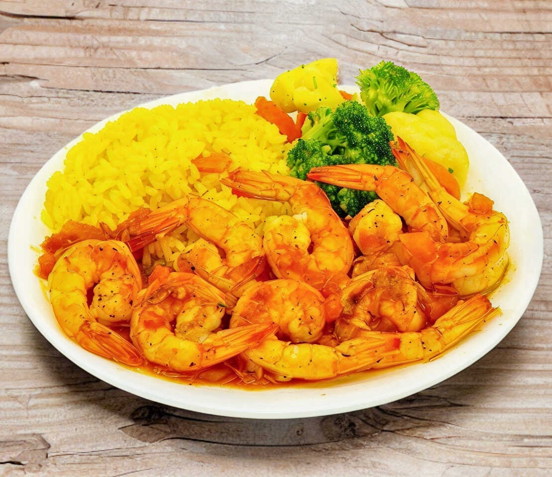 camarones cocinados a la plancha y bañados en salsa diabla bien picosita y acompañados de arroz y verduras al vapor