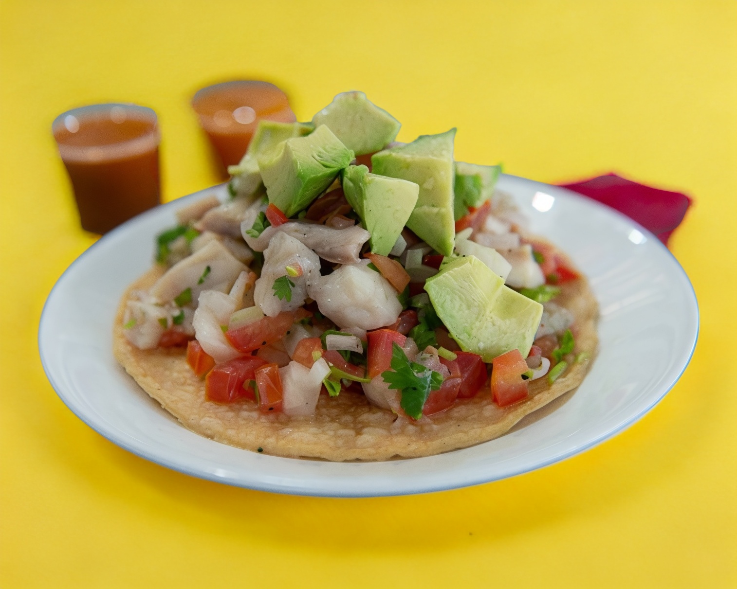Dos deliciosas tostadas de ceviche mas consomé de pescado 8oz