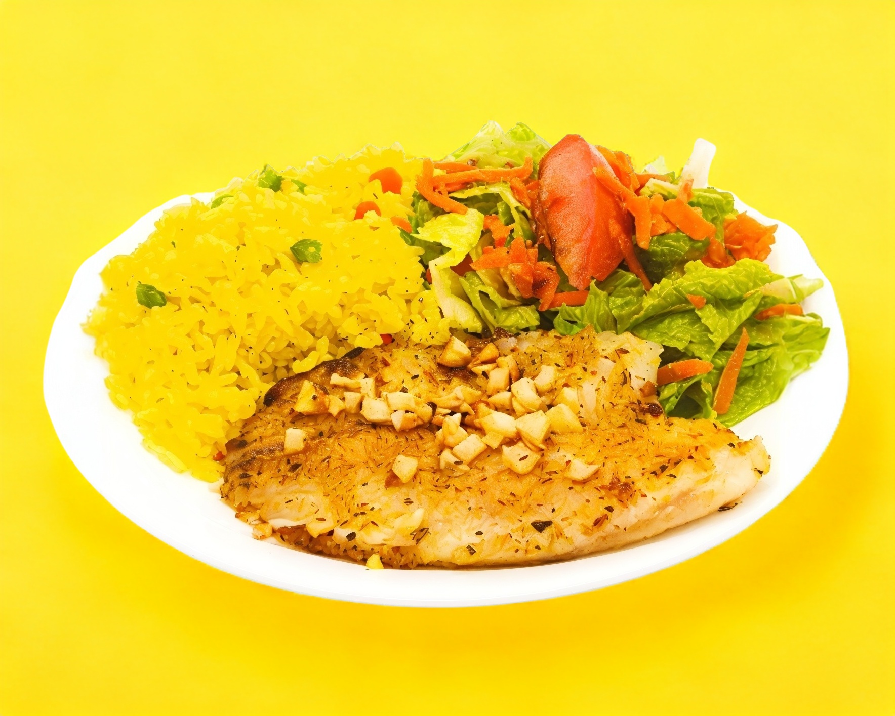este platillo es una delicia, filete de pescado bañado con hojuelas de ajo y acompañado de arroz y verduras al vapor