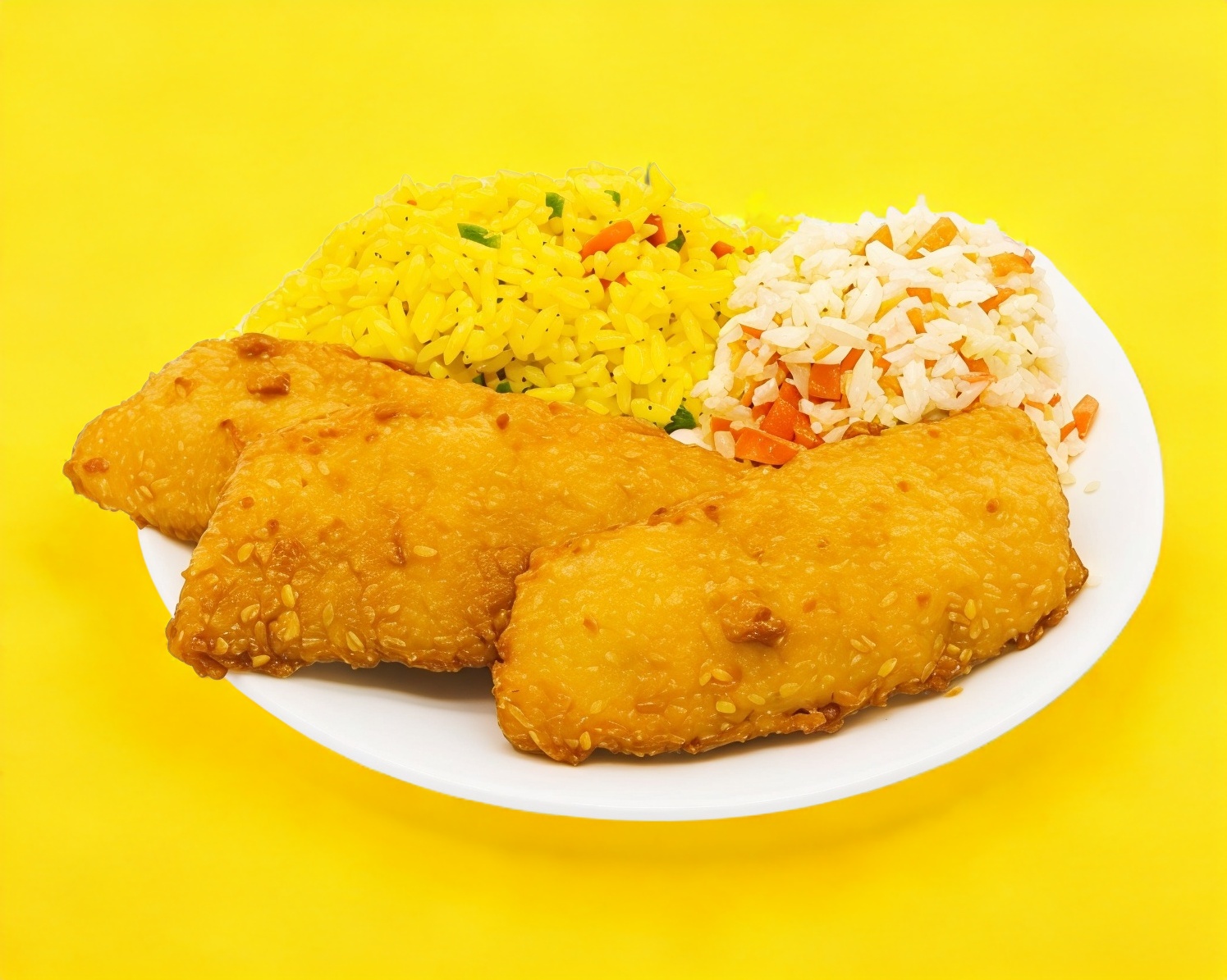 Filete empanizado acompañado de arroz azafranado, 1/2 litro de col y salsa tártara.