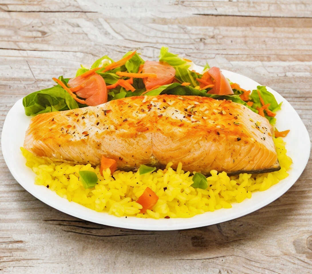 Platillo estrella, salmón a la plancha sazonado y acompañado con arroz y ensalada mixta.