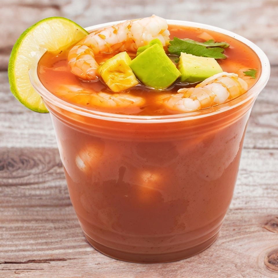Filete y camarones marinados con vinagreta especial y tomate, cebolla, pepino, aguacate y acompañado de tostadas. Vaso de 16 onzas
