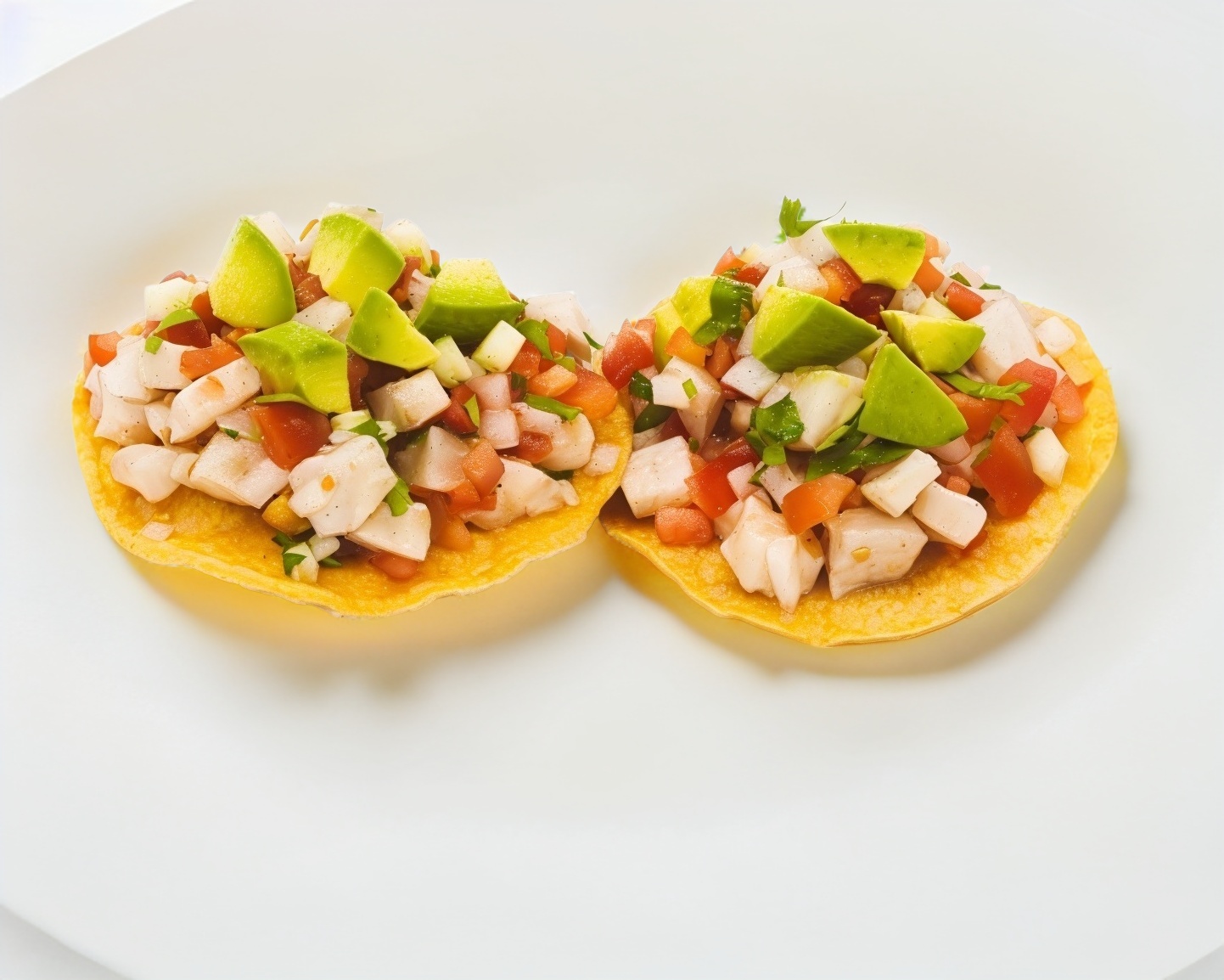 Una Tostada con ceviche de pescado tilapia, tomate, cebolla, aguacate y vinagreta de la casa. Viene por unidad