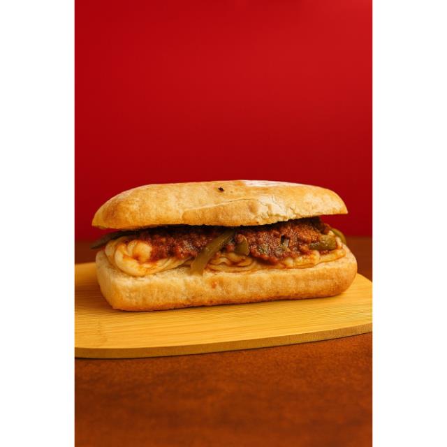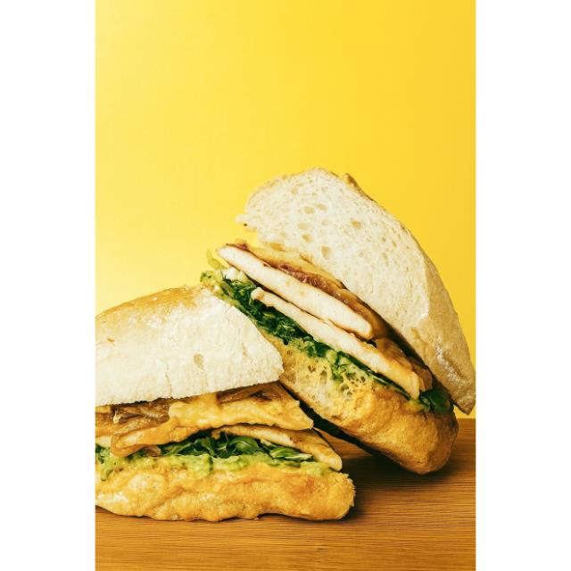 Pan de Ciabatta, pechuga de pollo (100 gr), manchego gratinado, espinaca, cebolla caramelizada y aguacate, aderezado con spicy mayo.