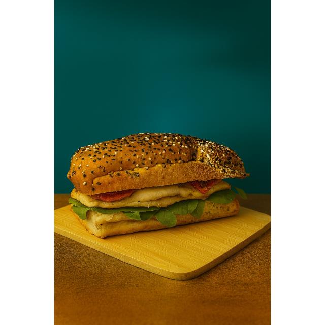 Pan de Ciabatta, pechuga de pollo (100 gr), tomates deshidratados, mozzarella, espinaca, pimientos asados y aderezo de lemon mayo.