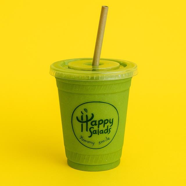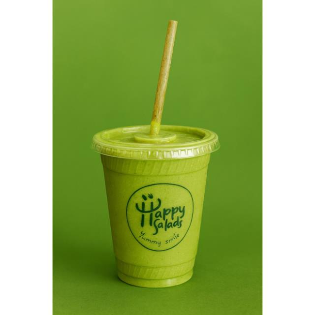 Leche de almendra, matcha, mango, plátano, espinaca y miel de agave.