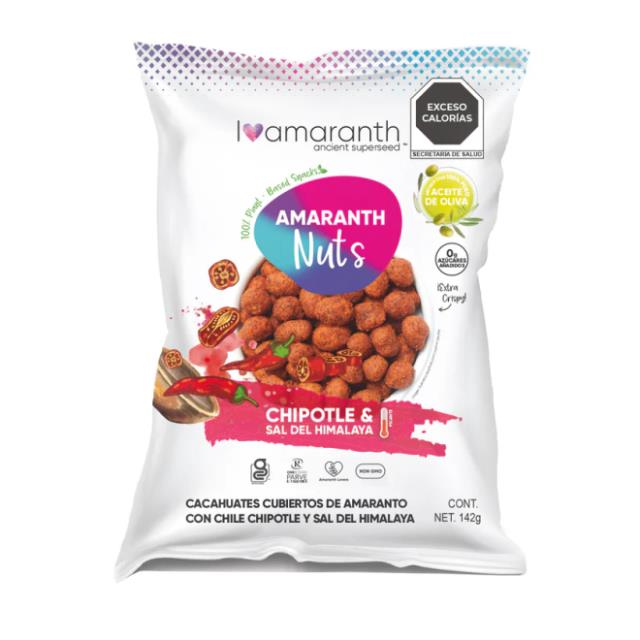 Cacahuates cubiertos de amaranto con chile chipotle y sal del himalaya