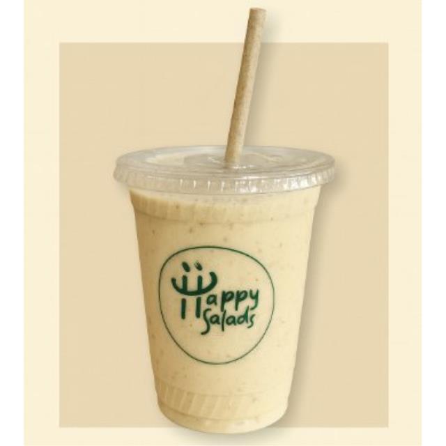Leche de Almendra, plátano, crema de cacahuate y dátil con mermelada de fresa.