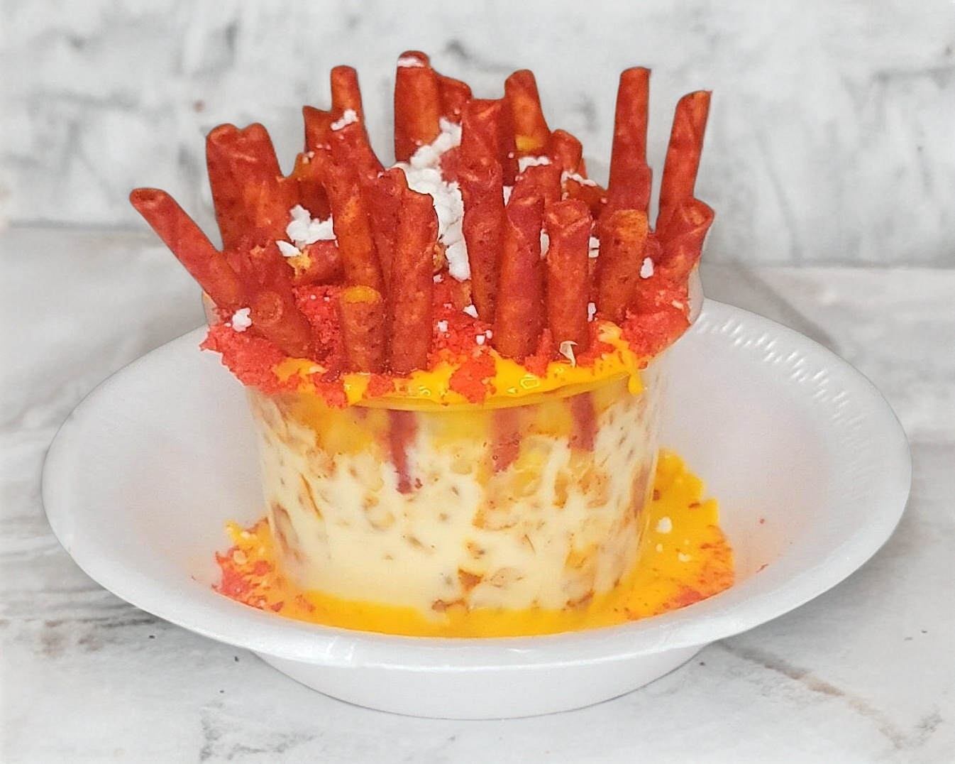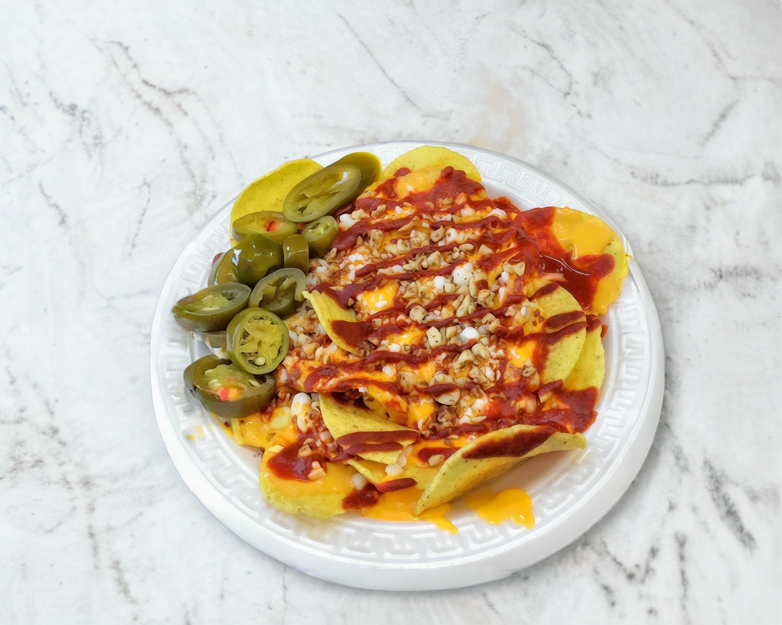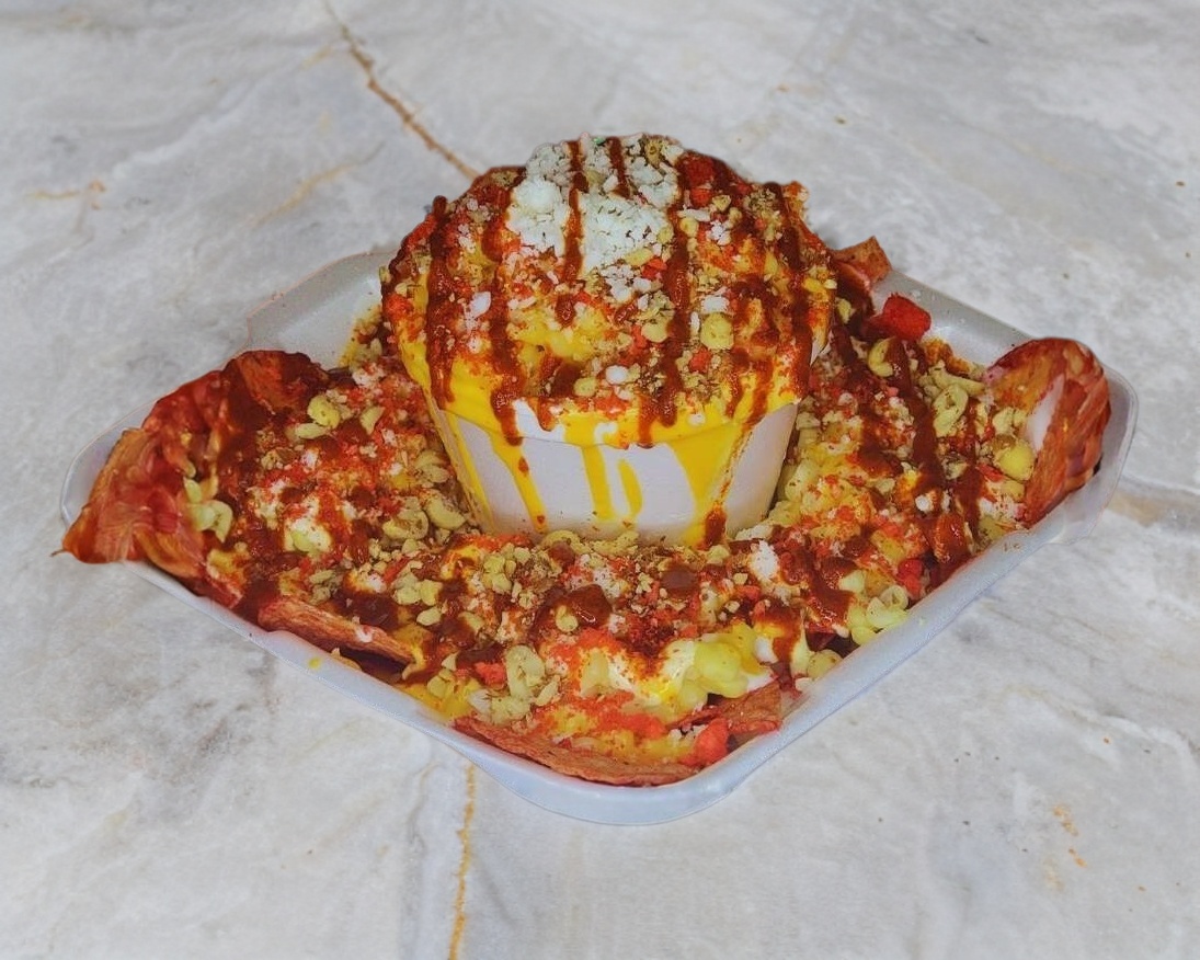 Elote blanco, crema o mayonesa, queso amarillo, queso blanco, chilito que no pica, ruffles, cheetos flamín hot, aderezo de chipotle. Takis se mandan aparte.