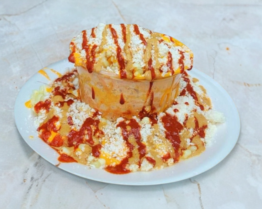 Elote blanco, crema/mayonesa, queso amarillo, queso blanco, chilito que no pica, ruflesta, takis, cheetos flamín hot, aderezo de chipotle.