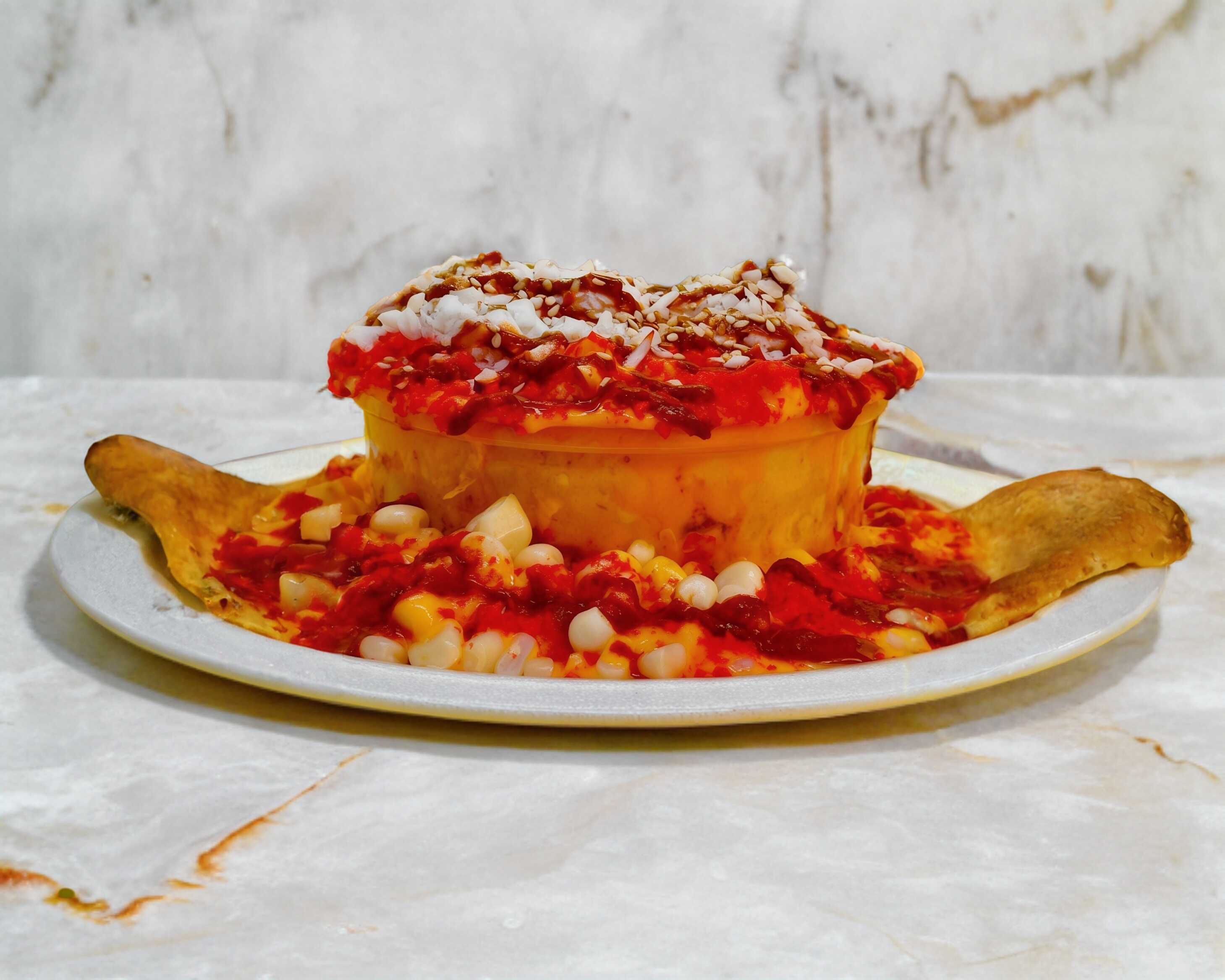 Elote blanco, crema/mayonesa, queso amarillo, queso blanco, chilito que no pica, ruffles, cheetos flamín hot, aderezo de chipotle.