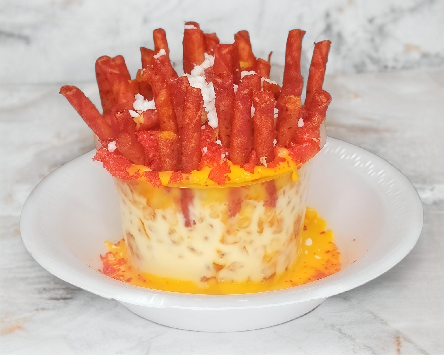 Elote blanco, crema o mayonesa, queso amarillo, queso blanco, chilito que no pica, ruffles, cheetos flamín hot, aderezo de chipotle. Takis se mandan aparte.