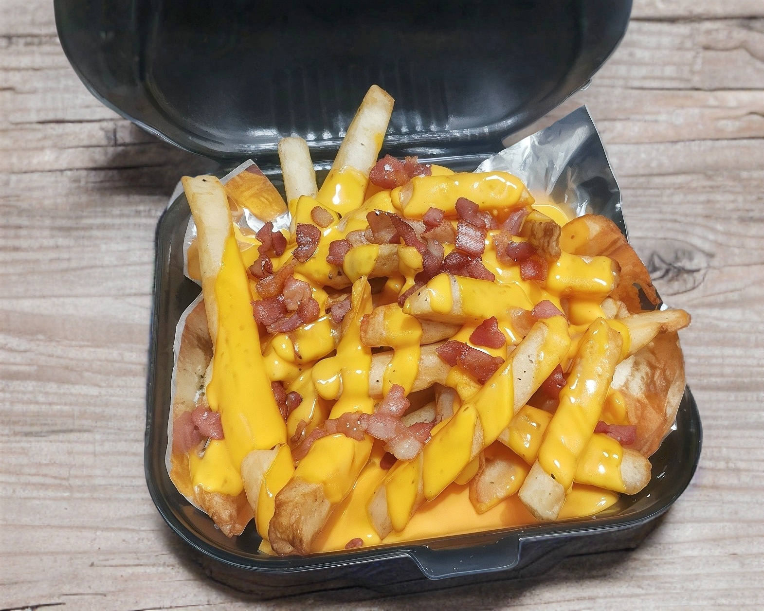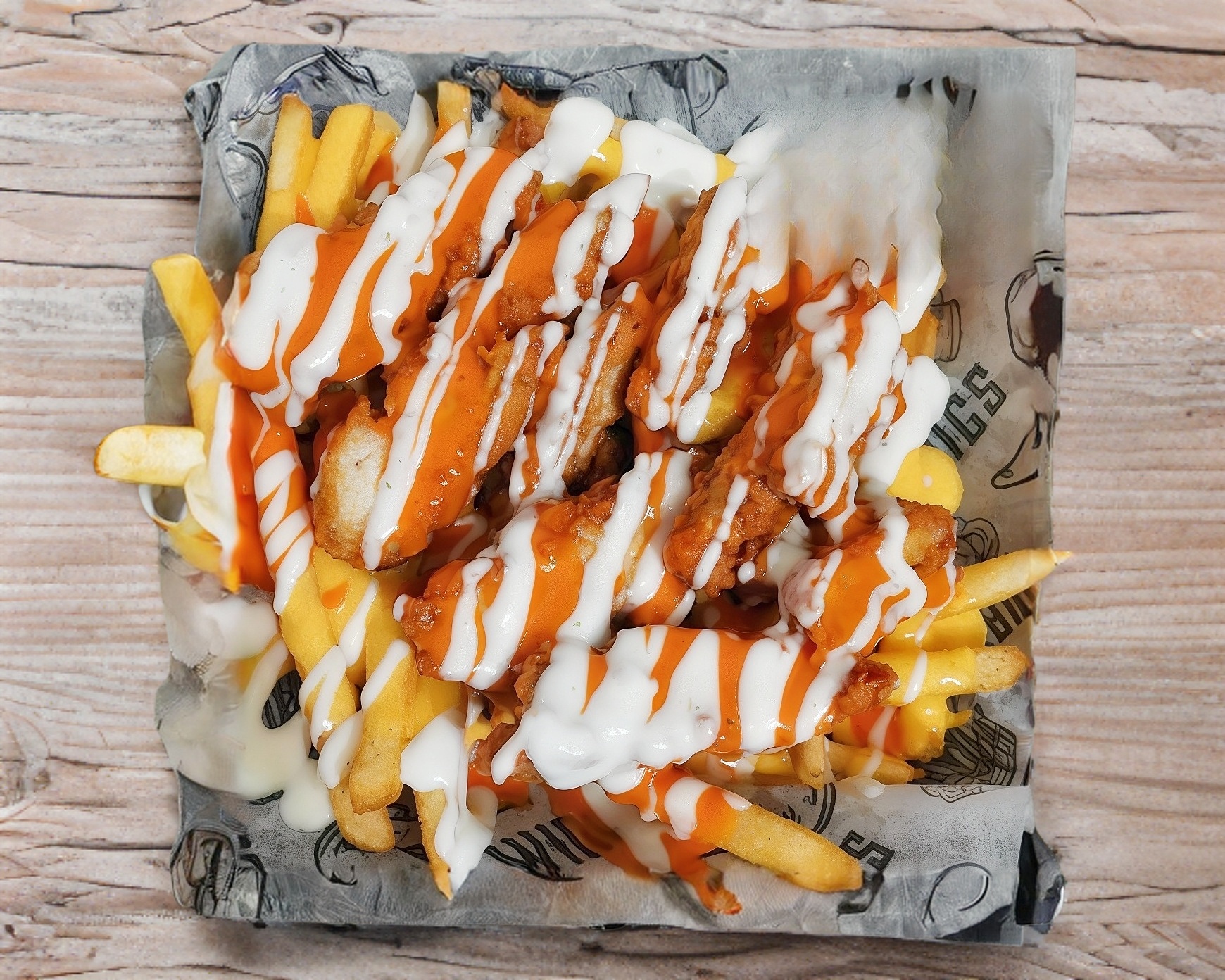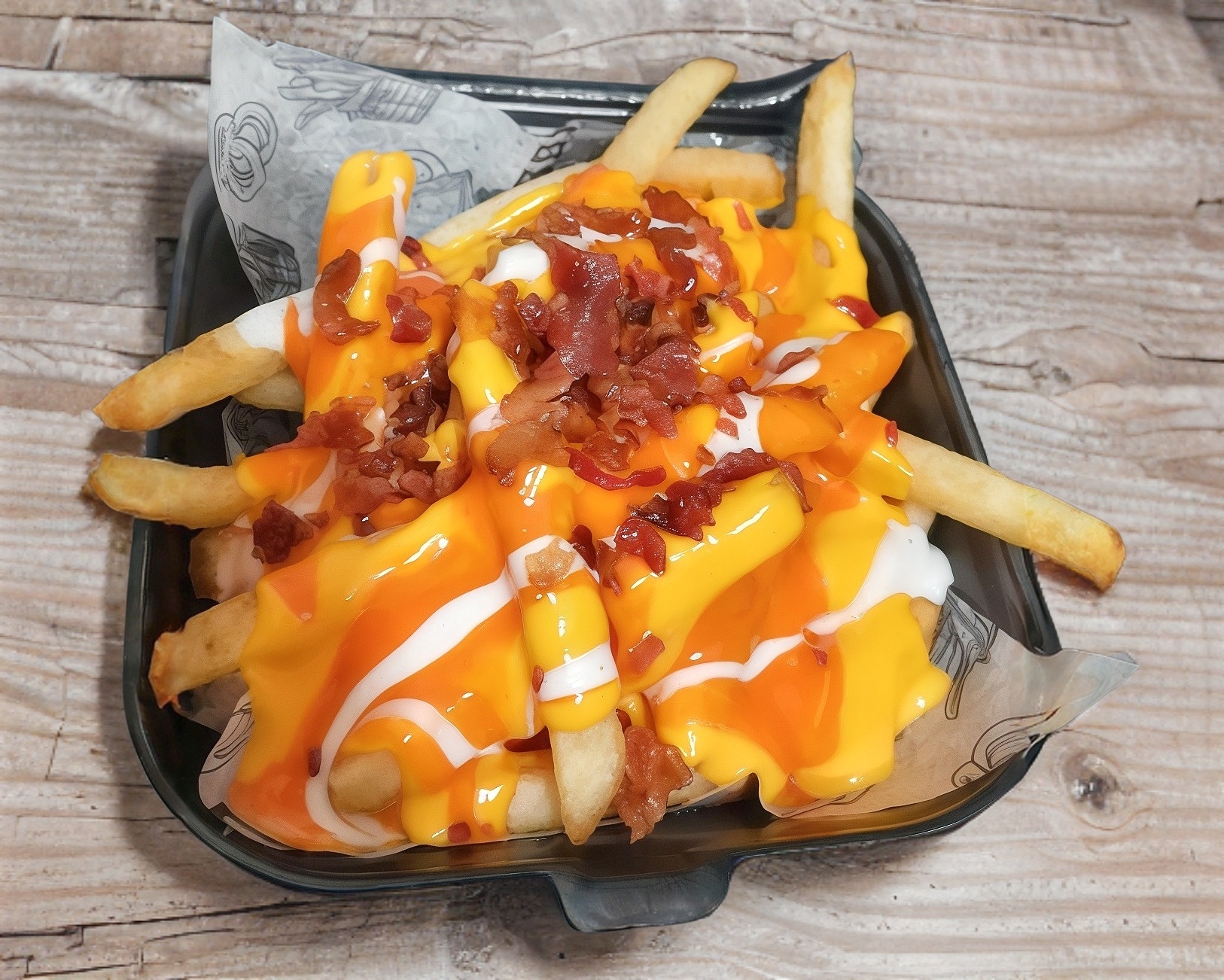 Papas a la francesa bañadas en salsa de queso, salsa búfalo, ranch y tocino natural.