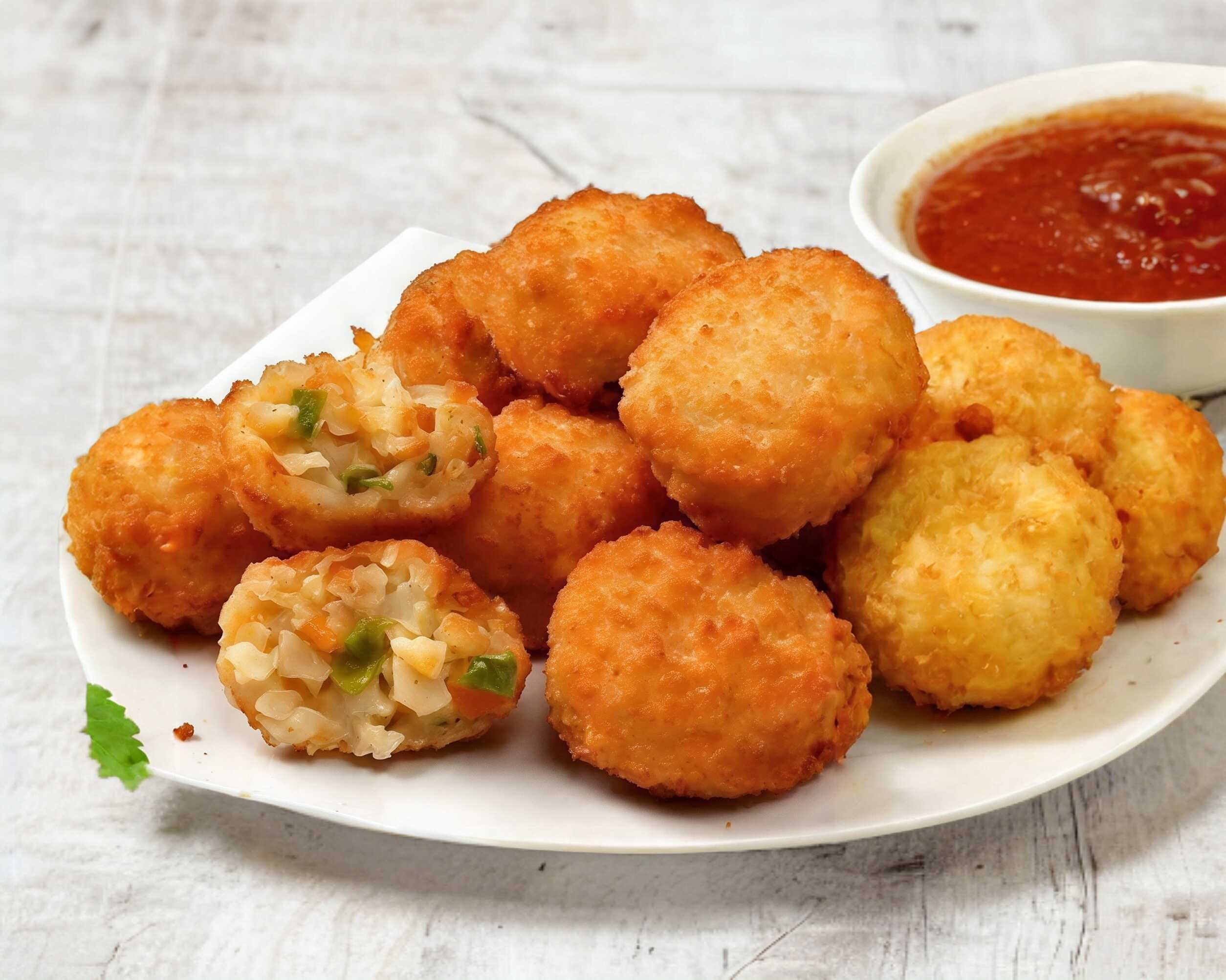 10 piezas de deliciosas bolitas de queso y papa acompañadas de aderezo chipotle