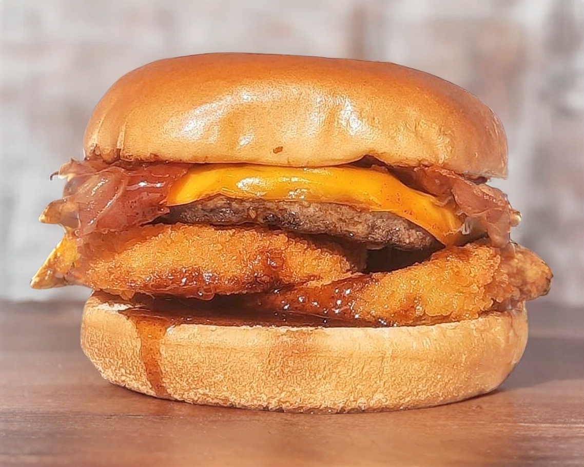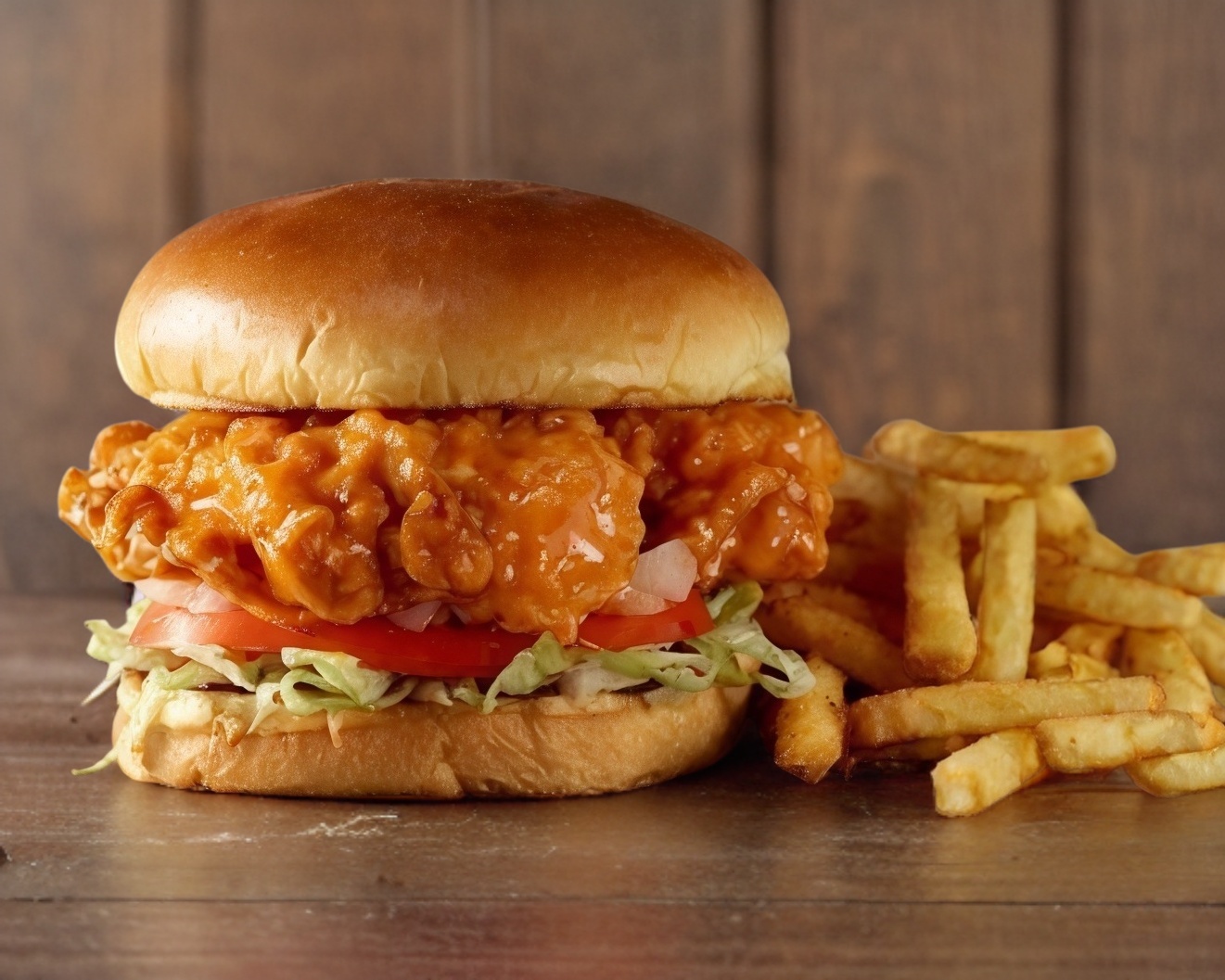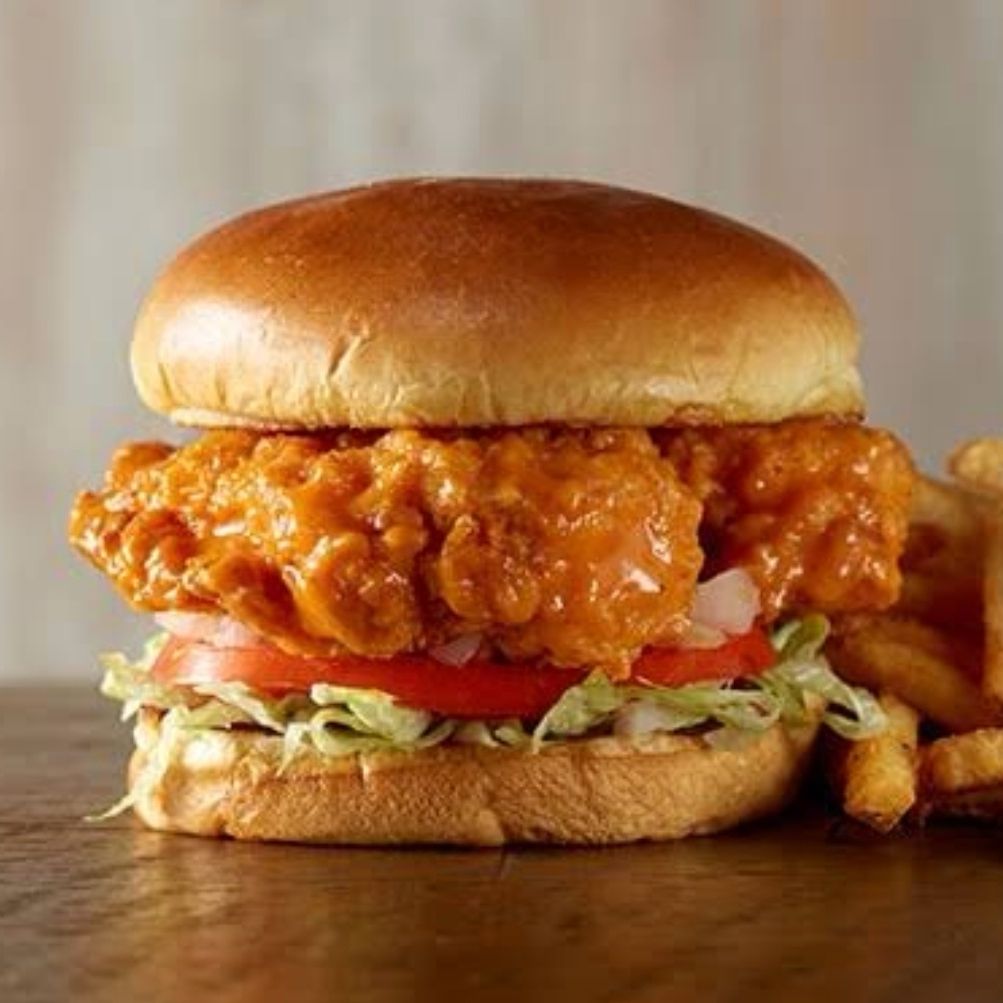 Delicioso pan brioche, pechuga de pollo bañada en salsa buffalo,aderezo ranch, lechuga, tomate ,cebolla y pepinillos