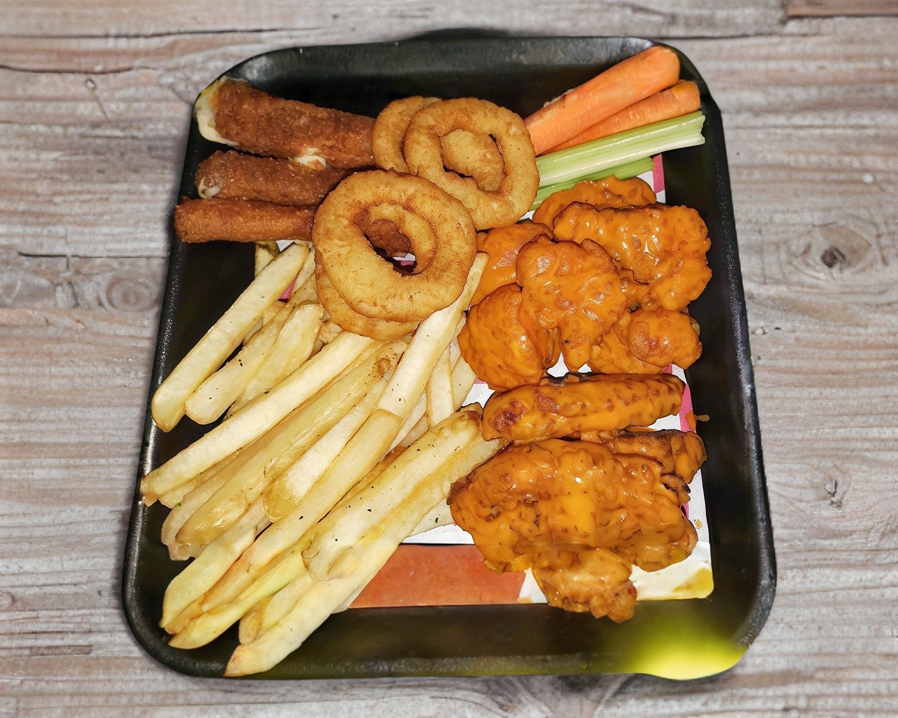 4 Boneless, 4 alitas, papas a la francesa, 3 dedos de queso, 4 aros de cebolla, vegetales, salsa boloñesa y dip ranch.