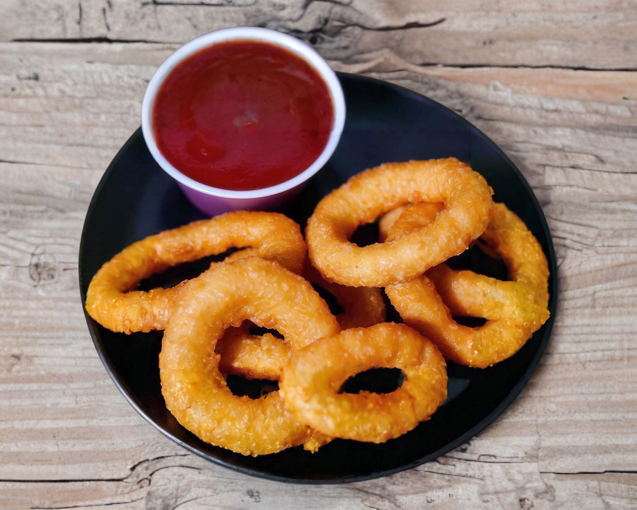 10 Aros de cebolla y un aderezo o salsa a elegir.