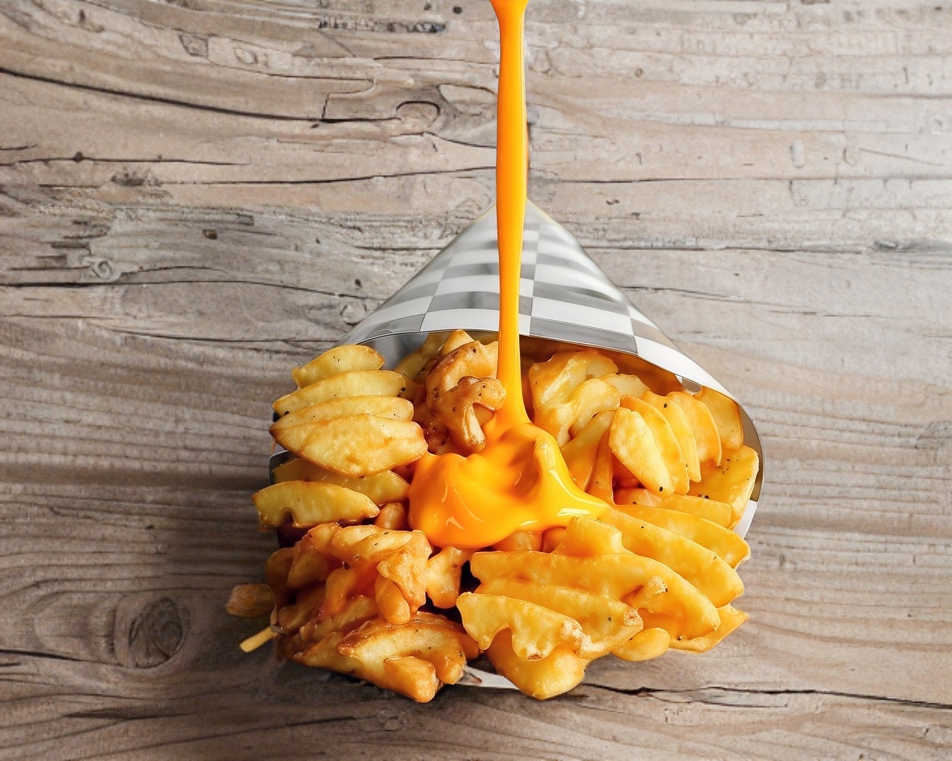 Papas criscut bañadas en queso cheddar y trocitos de tocino natural